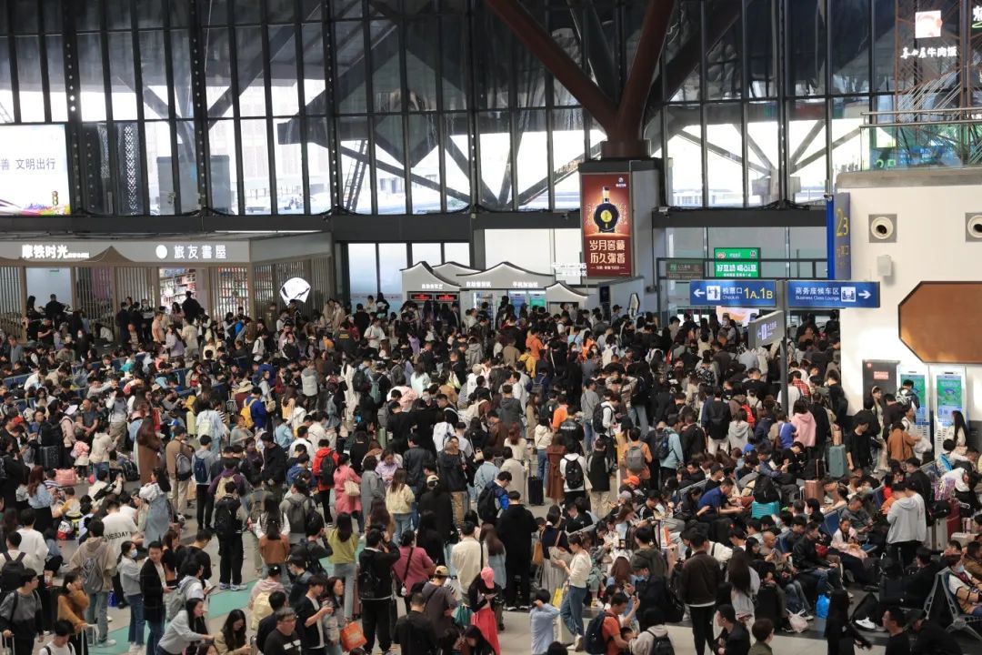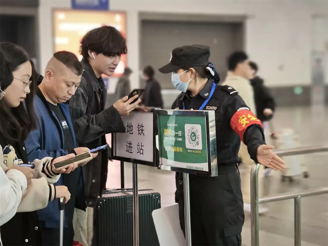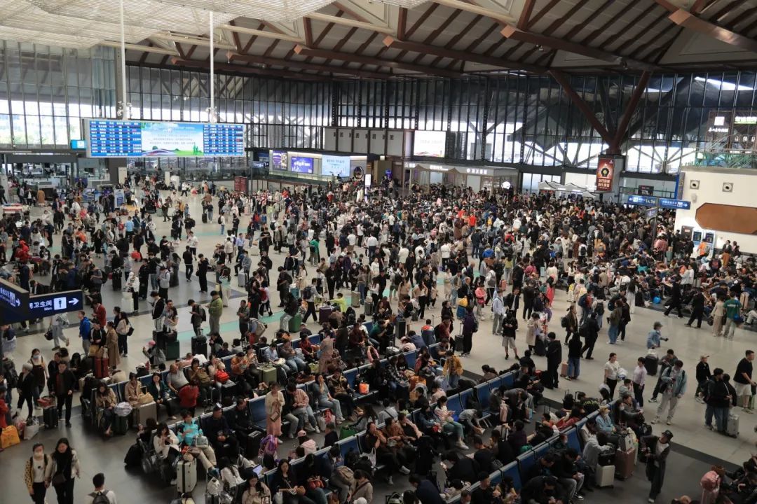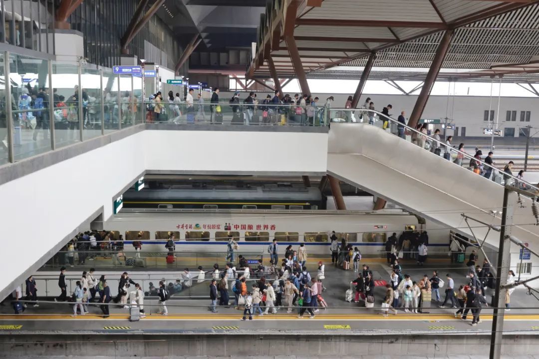 五一期间苏州站每天安排15名高校志愿者在岗,分别在进站口、电梯口、服务台周边和自助售取票机等场所,为旅客提供路线指引、问询解答、行李搬运、帮助购票等服务。