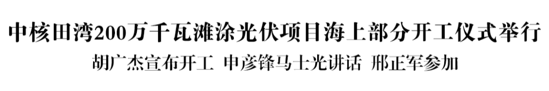 5月19日,中核田湾200万千瓦滩涂光伏项目海上部分开工仪式举行。省委常委、统战部部长胡广杰出席并宣布开工。中核集团总经理、党组副书记申彦锋,市委书记马士光出席并讲话。中国核电董事长、党委书记,中核集团总经理助理卢铁忠主持仪式。市长邢正军,省政府副秘书长杨新忠,自然资源部东海局副局长杨华,省发展和改革委员会副主任、省能源局局长戚玉松,省自然资源厅二级巡视员黄建东,市领导黄远征、任栋、华宏铭、韦怀余,以及国家交通运输部、中核集团有关领导等参加。