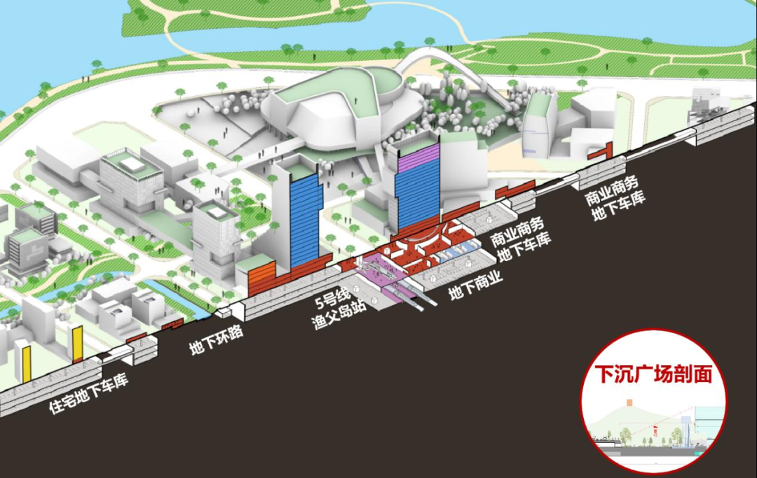 此外,结合地上地下协同开发的理念,未来在渔父岛TOD区域,还规划了“高端商务塔楼+文化艺术中心+商业综合体+高端公寓”等设施,将充分发挥三线换乘引流和滨湖生态优势,着力打造“文化+消费+酒店的复合活力中心”。
