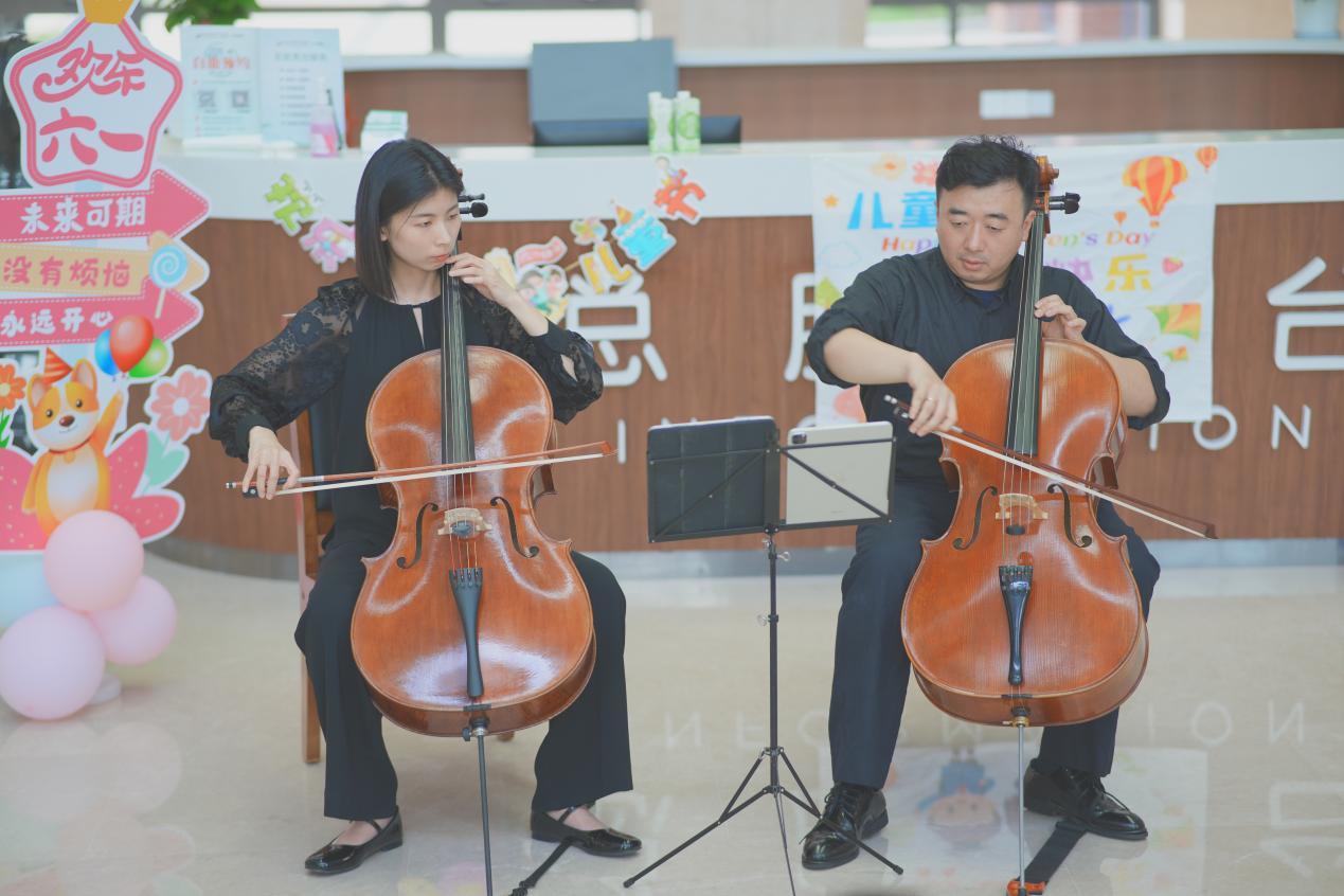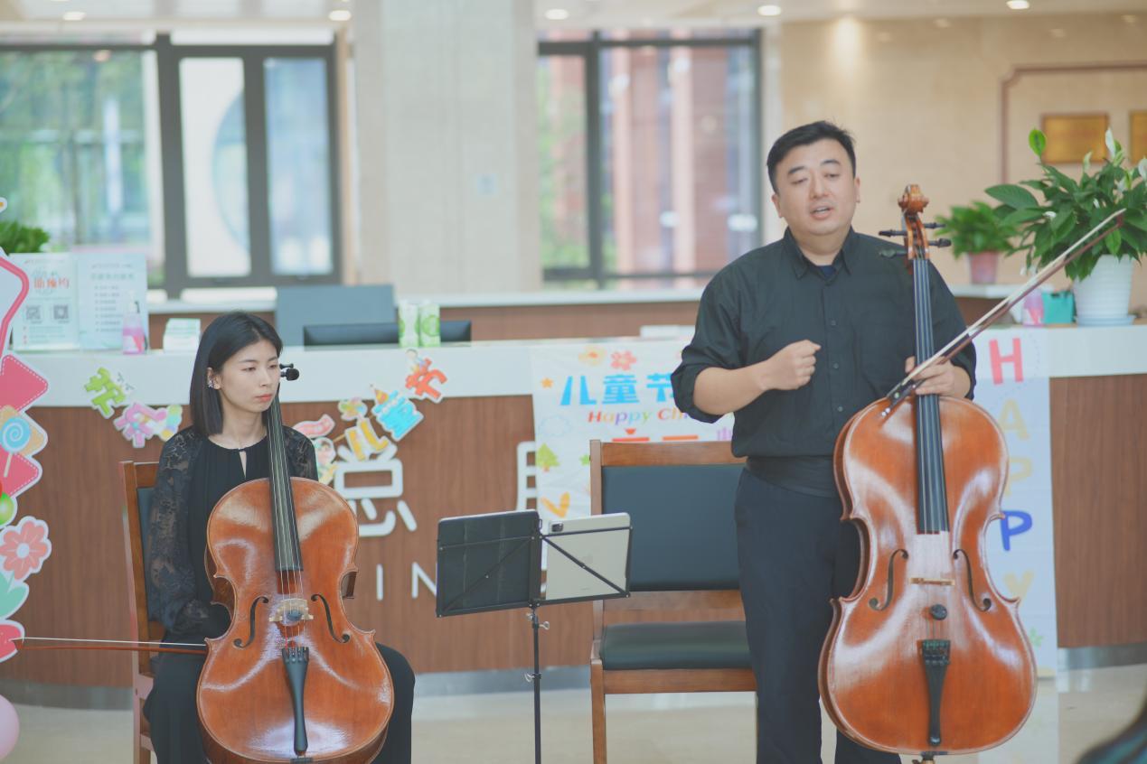 紧接着,欣光音乐心理工作室在门诊大厅,为患儿和家属呈现了一场温馨而动人的演奏音乐会。江苏交响乐团的两位优秀的大提琴演奏家邹欣光、邰阳坐在孩子们的身边,用一曲曲的音乐,感染着在座的所有人,孩子们在音乐的陪伴下,脸上绽放出了灿烂的笑容,家长们也在音乐声中感受到了无限的温暖与力量。