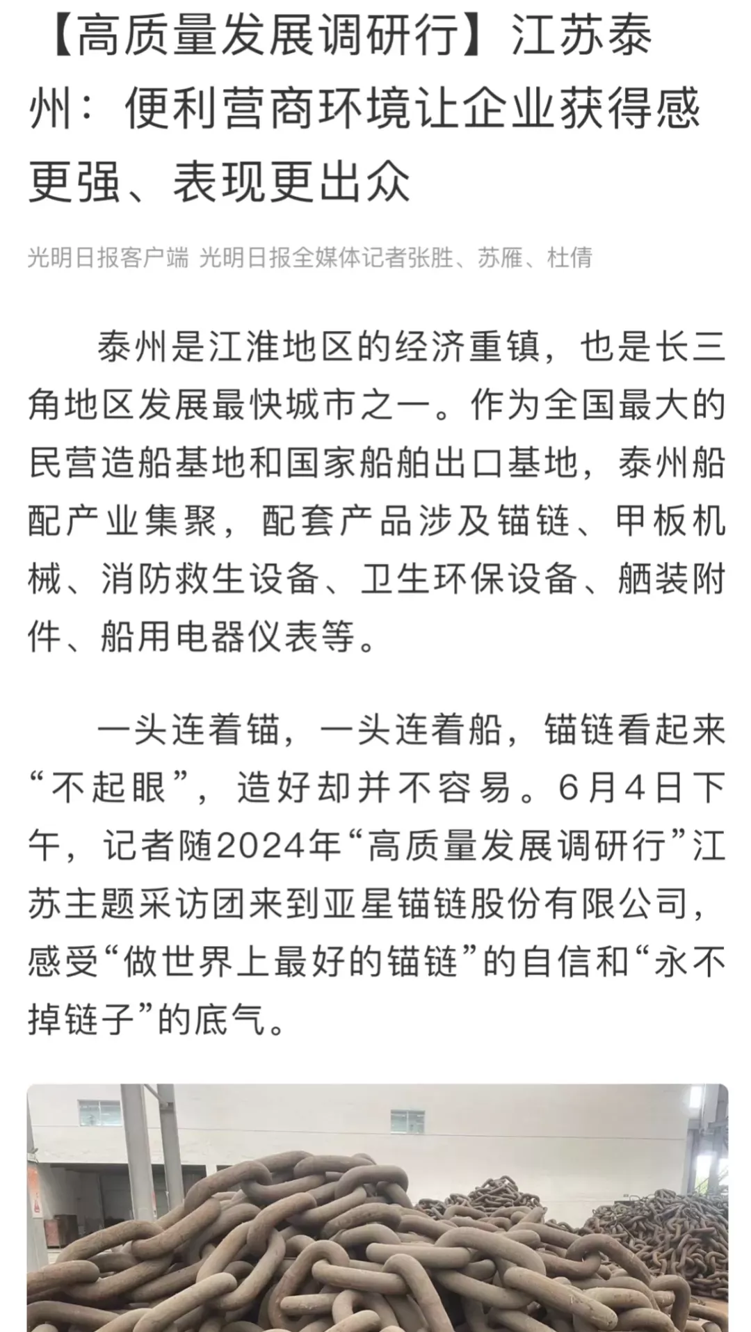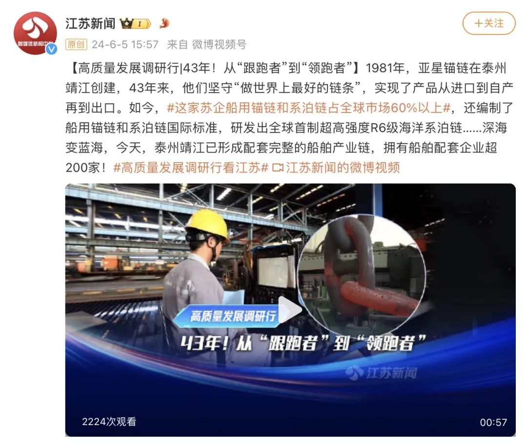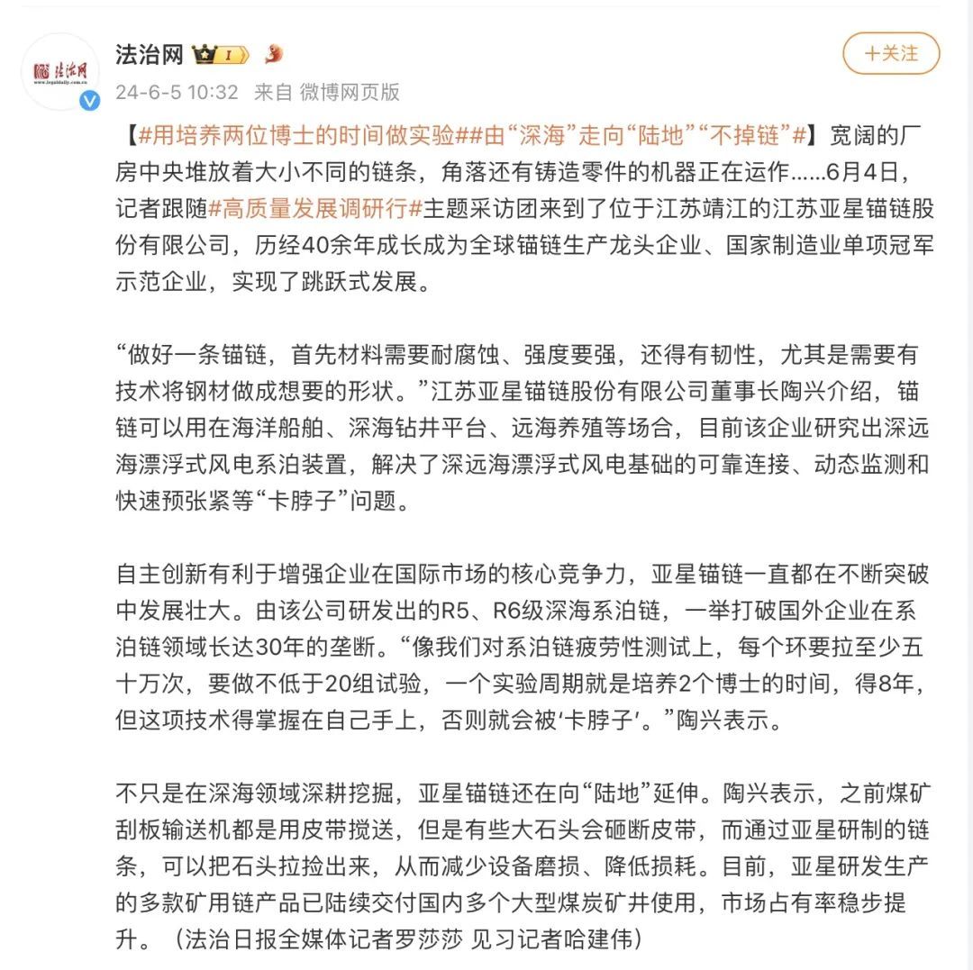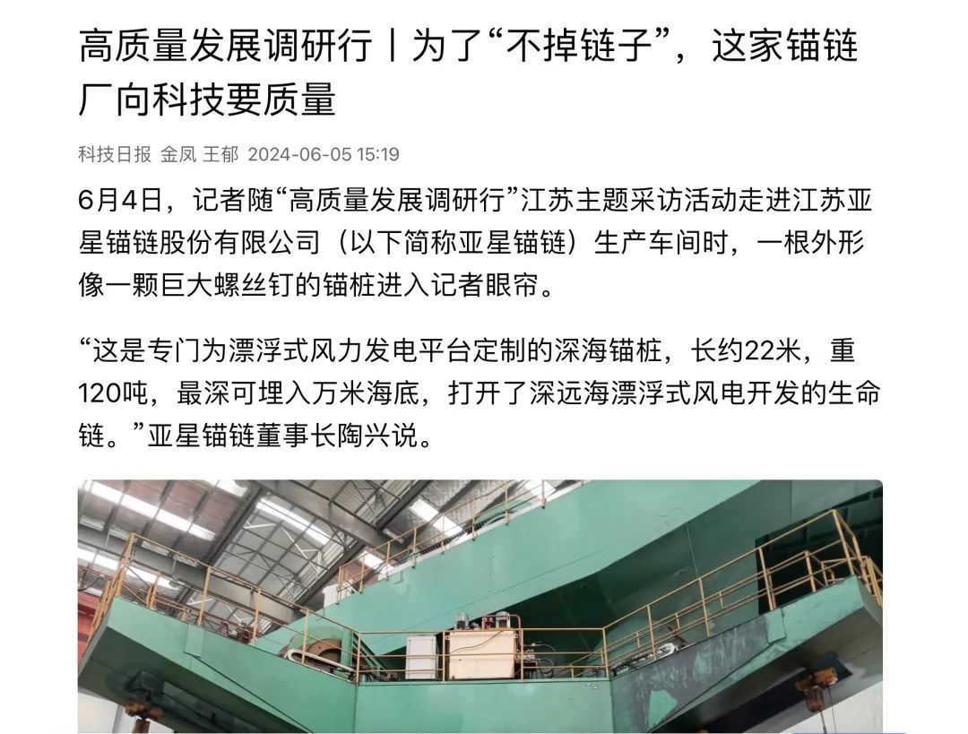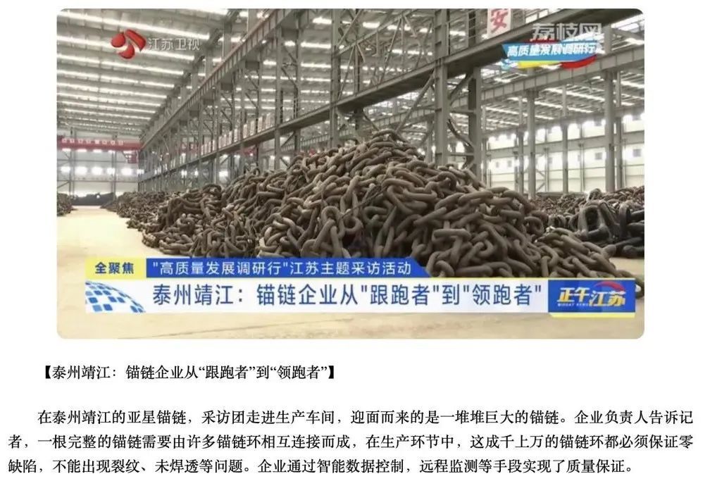作为全球锚链生产龙头企业、国家制造业单项冠军示范企业,靖江的亚星锚链成功研制R6系泊链,填补国际空白,并主导编制系泊链国际标准。