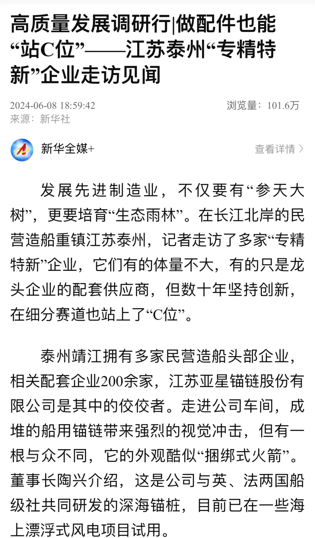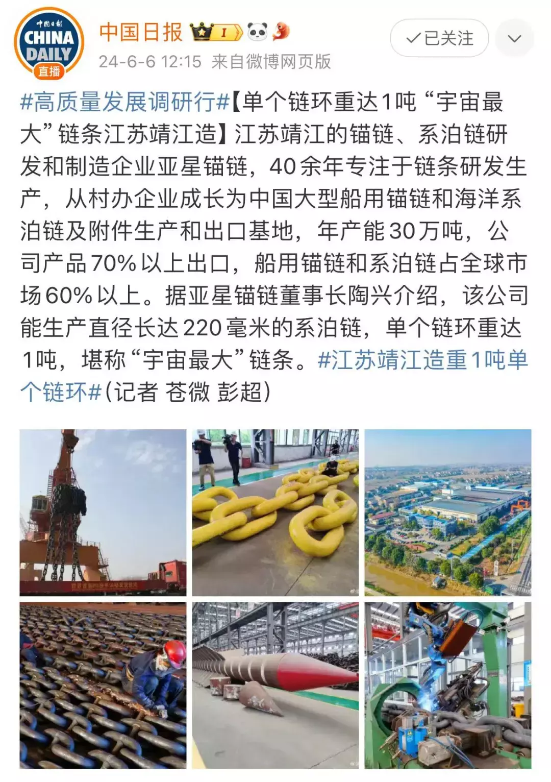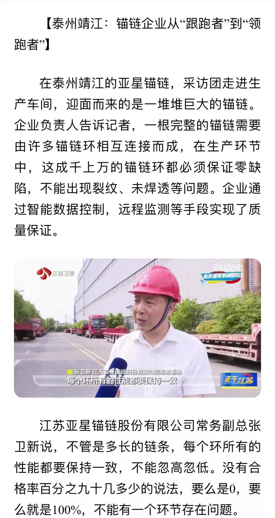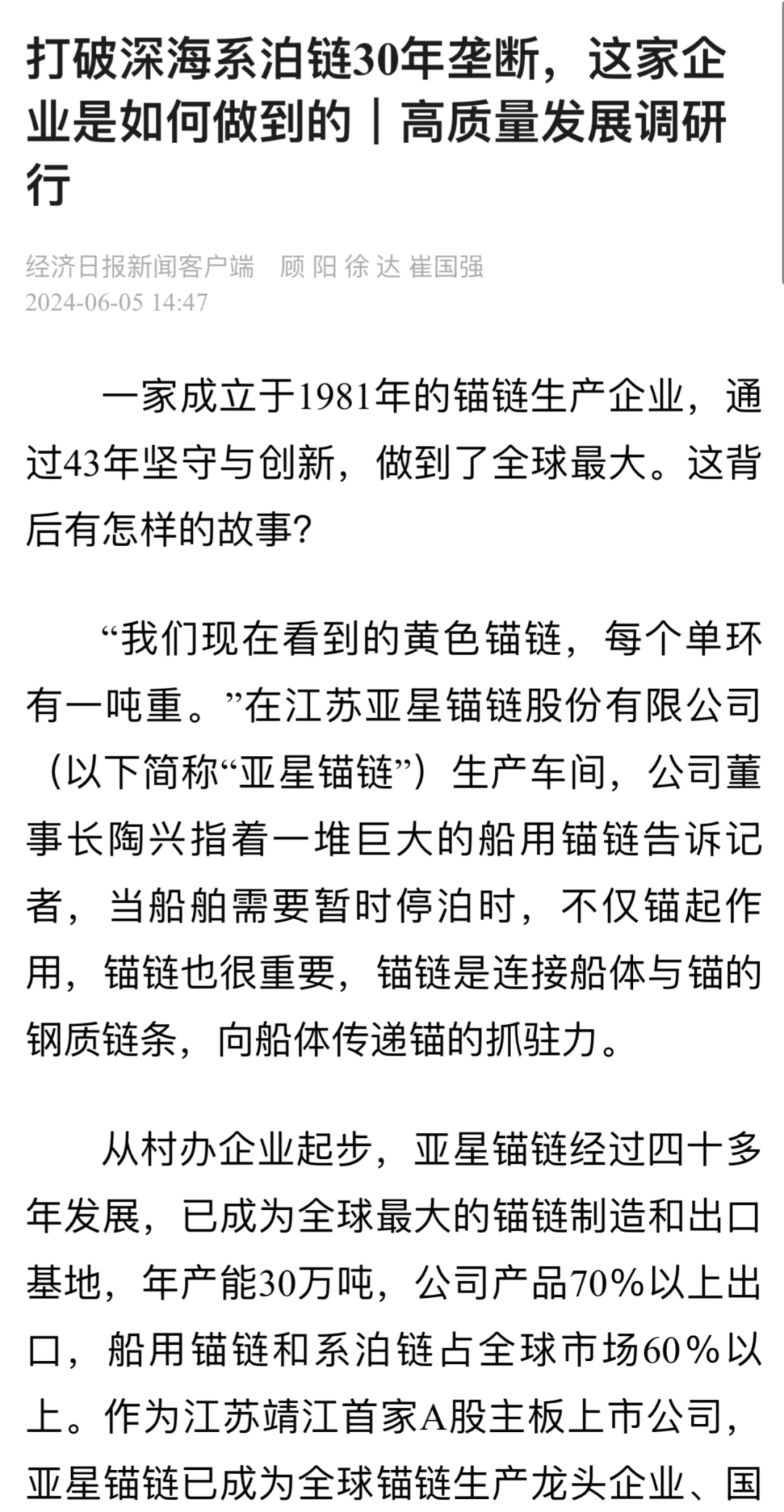 作为全球锚链生产龙头企业、国家制造业单项冠军示范企业,靖江的亚星锚链成功研制R6系泊链,填补国际空白,并主导编制系泊链国际标准。
