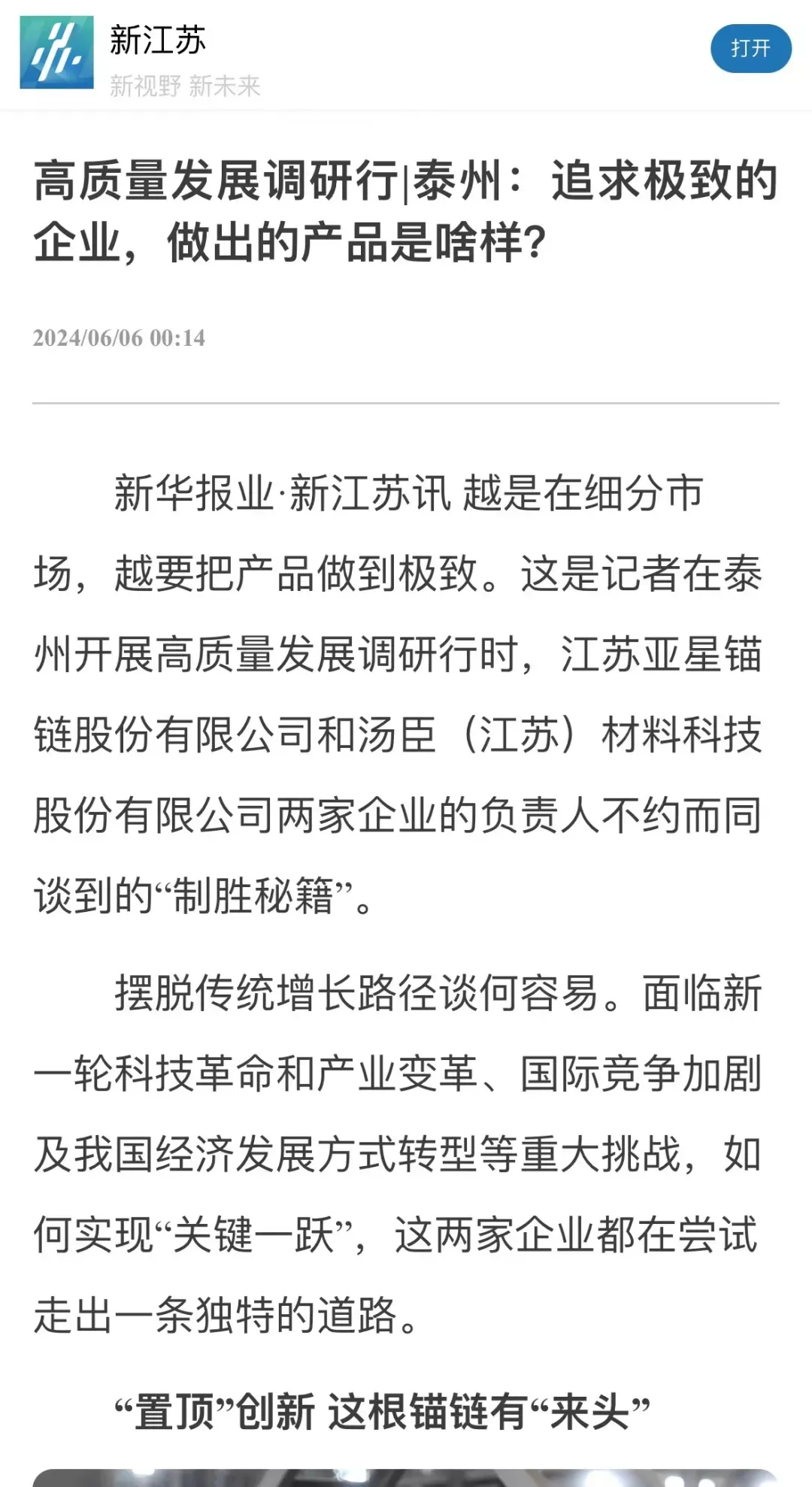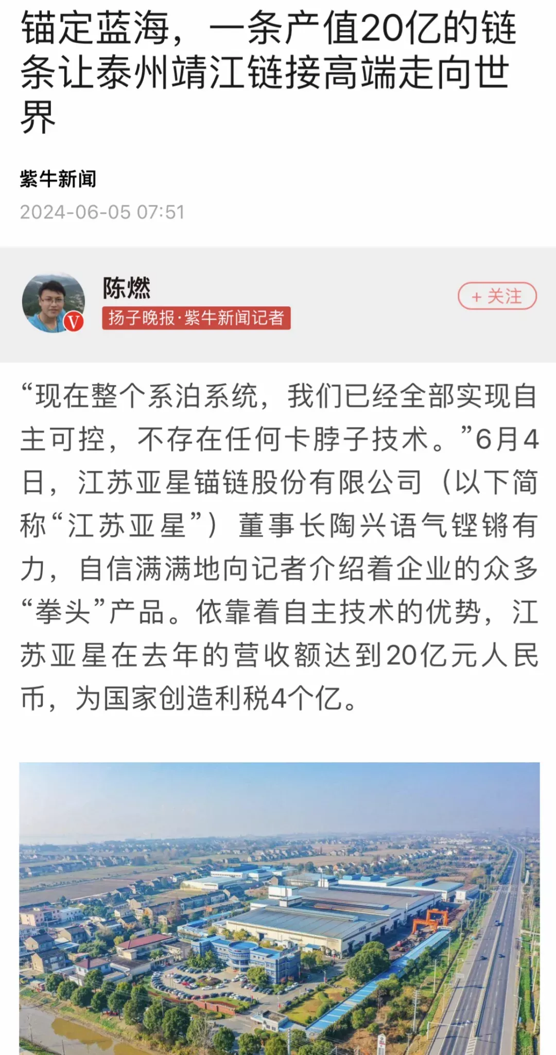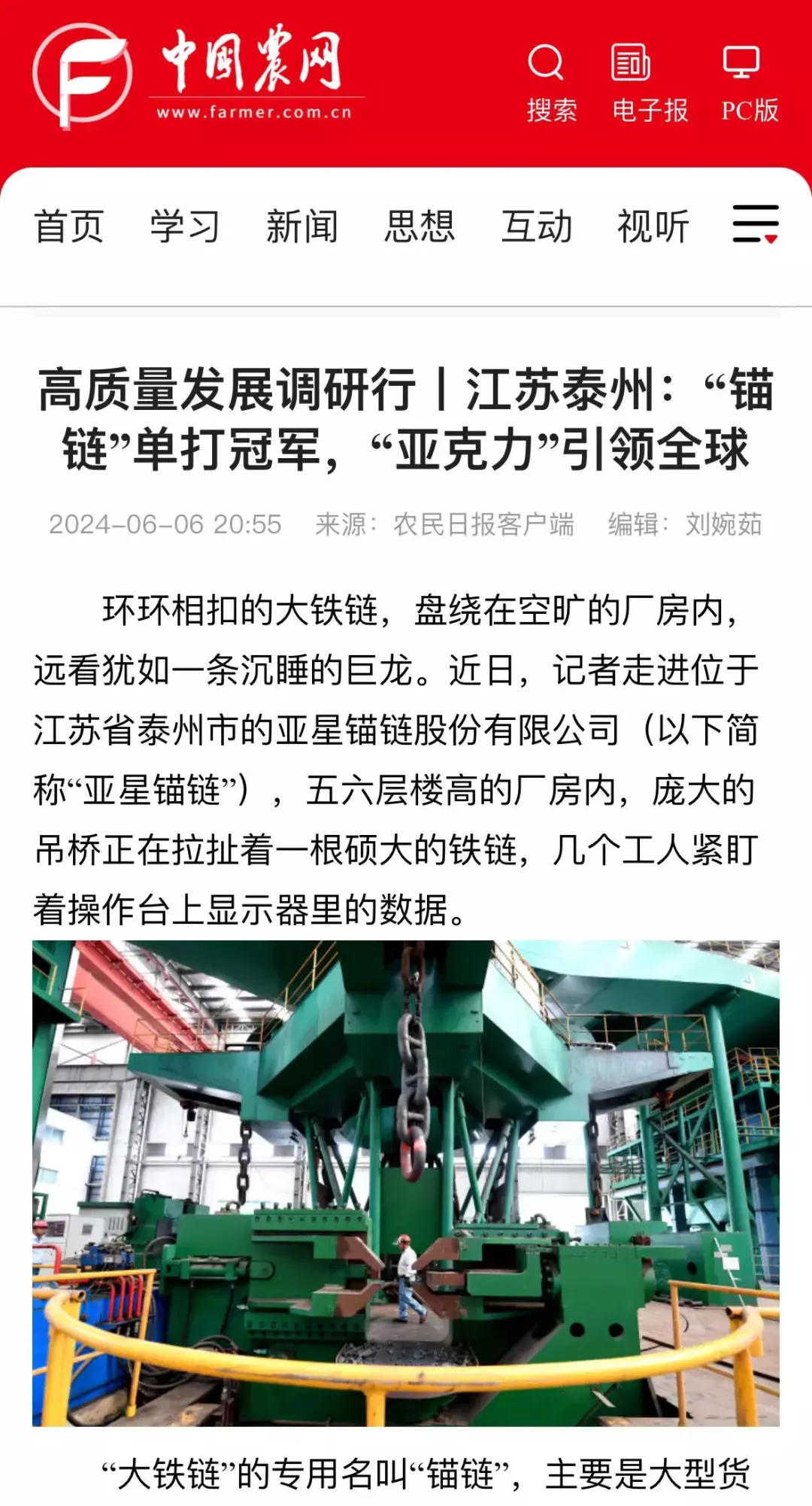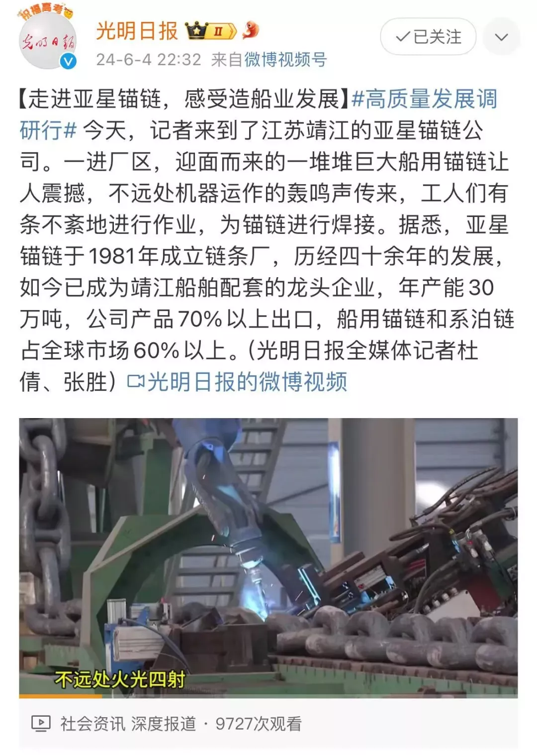 作为全球锚链生产龙头企业、国家制造业单项冠军示范企业,靖江的亚星锚链成功研制R6系泊链,填补国际空白,并主导编制系泊链国际标准。