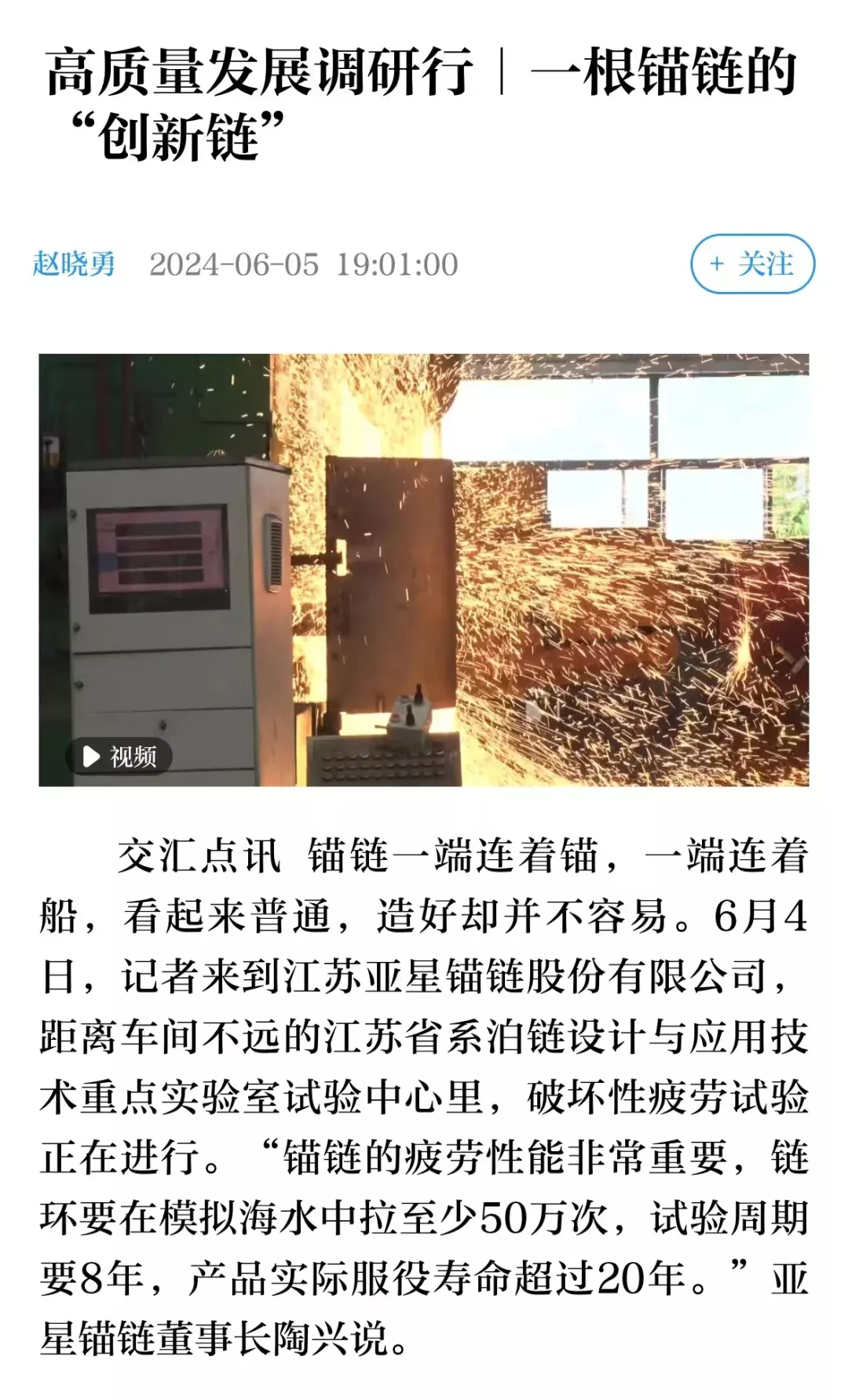 采访团一行边走边问,对企业的持续研发表示肯定,亚星锚链生产研发的深海锚桩,代表着行业最高难度直径达220毫米的链环,突破“卡脖子”技术的连接件、系泊链等产品,都给大家留下了深刻印象。
