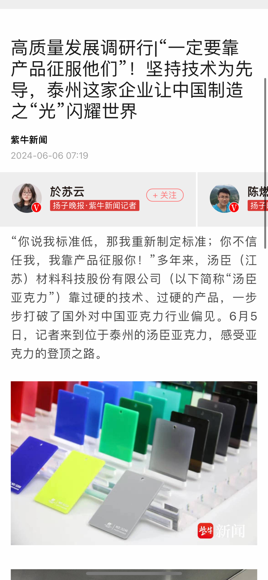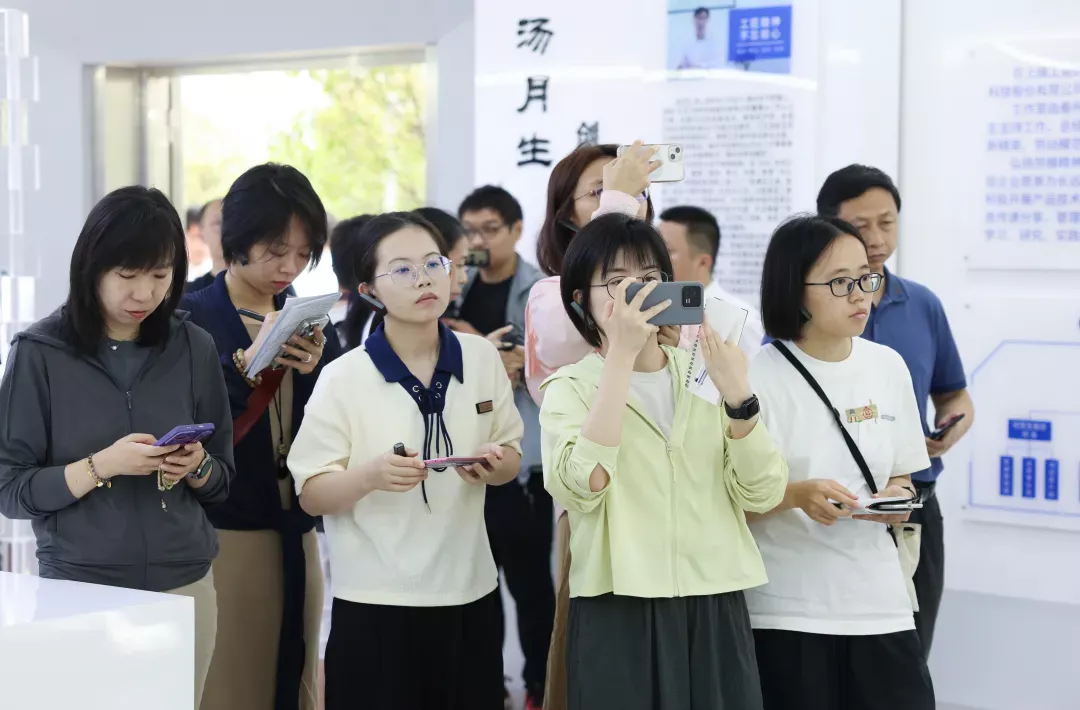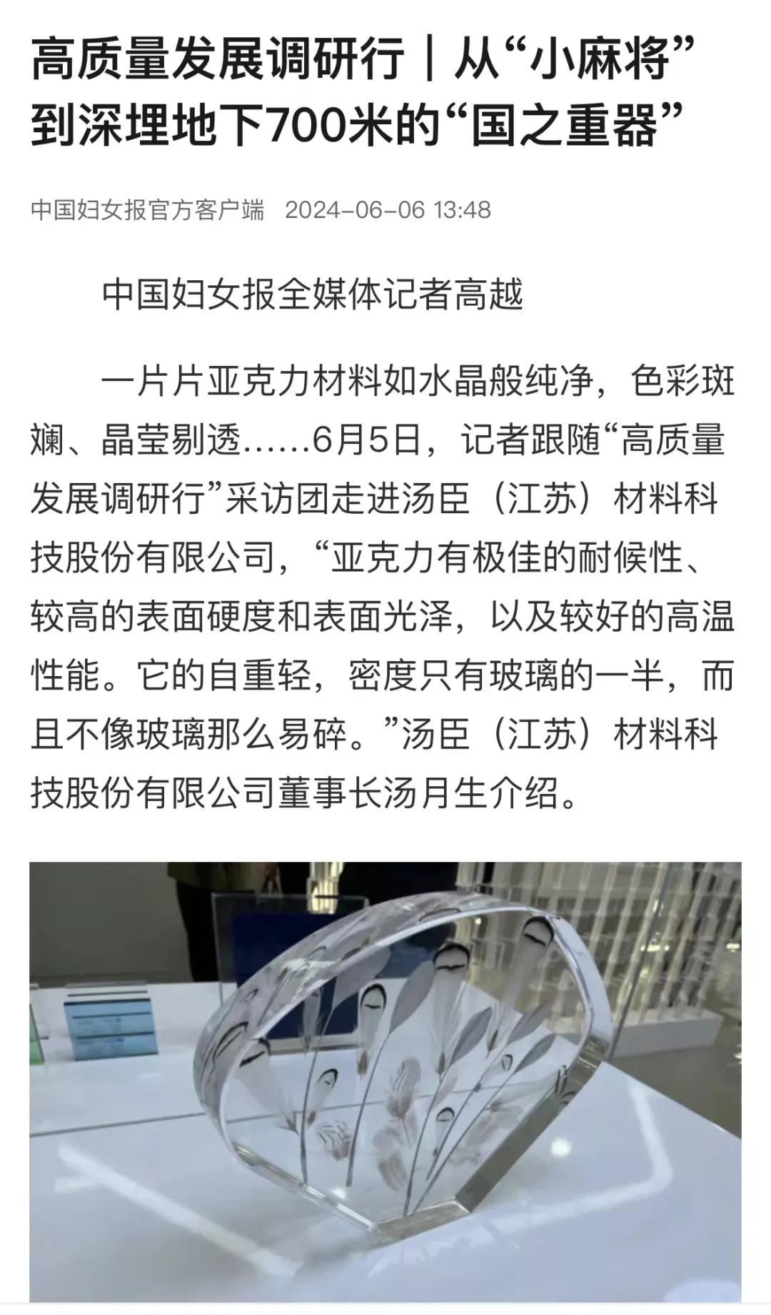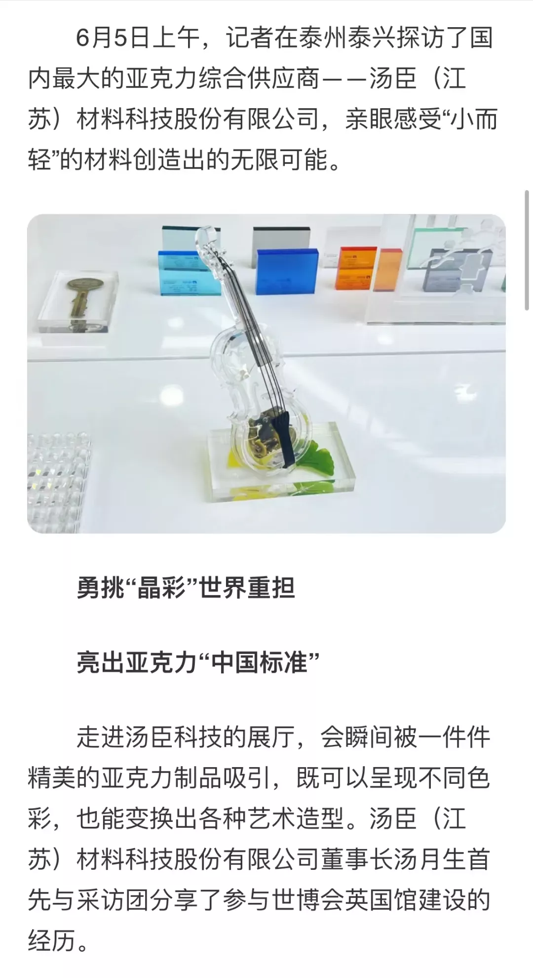 采访团一行来到展厅、生产车间,了解企业发展历程,听取技术、工艺介绍,对企业坚持自主研发、高效产业化应用赞叹不已。现场陈列的亚克力塑造的“晶彩”产品,更是吸引了众多媒体记者按下相机快门。