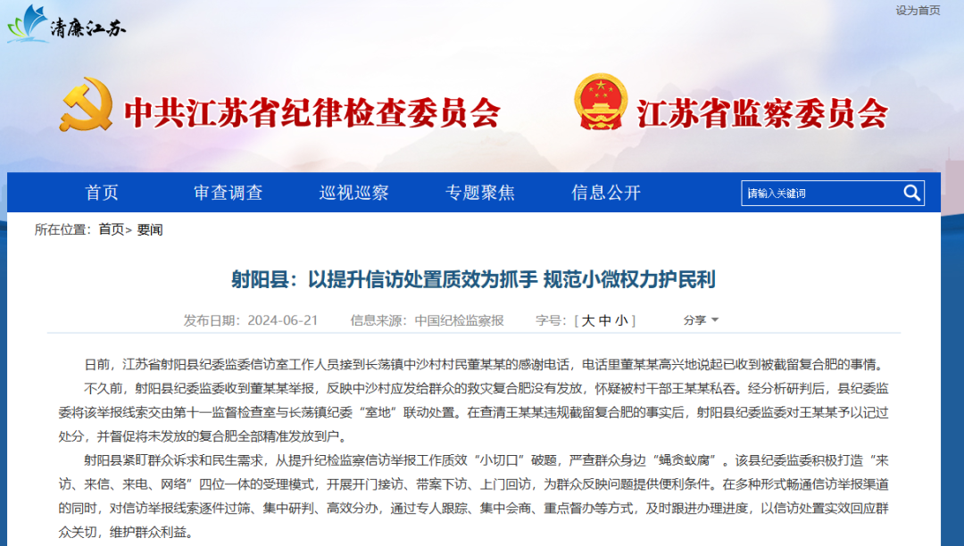 不久前,射阳县纪委监委收到董某某举报,反映中沙村应发给群众的救灾复合肥没有发放,怀疑被村干部王某某私吞。经分析研判后,县纪委监委将该举报线索交由第十一监督检查室与长荡镇纪委“室地”联动处置。在查清王某某违规截留复合肥的事实后,射阳县纪委监委对王某某予以记过处分,并督促将未发放的复合肥全部精准发放到户。