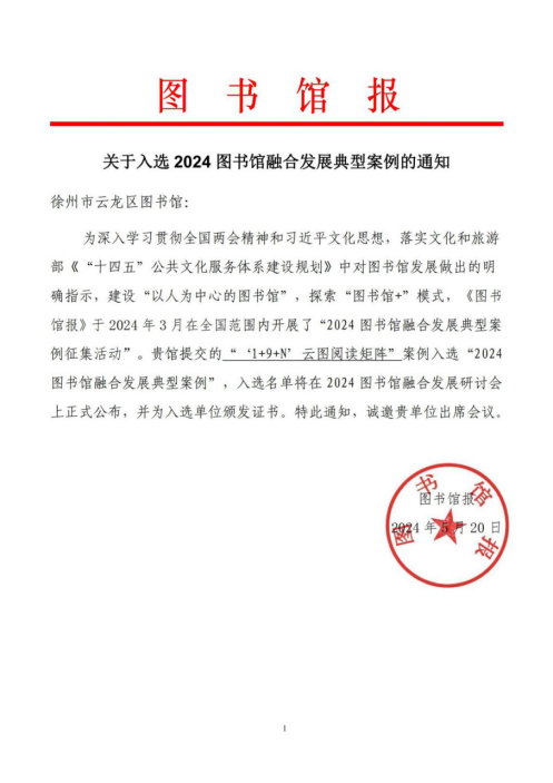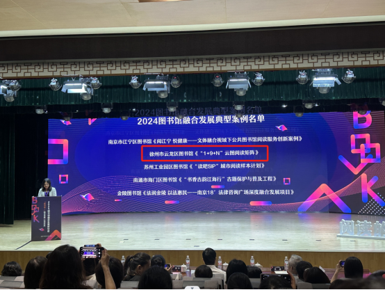 6月28日,《“图书馆+”融合发展 引领未来:2024图书馆融合发展研讨会》开幕式在常州市图书馆举行,年轻的云龙区图书馆凭借“‘1+9+N’云图阅读矩阵”建设在图书馆融合发展领域的创新实践,从全国各地图书馆脱颖而出,与南京图书馆、湖南图书馆等单位共同荣获“2024图书馆融合发展典型案例”荣誉。