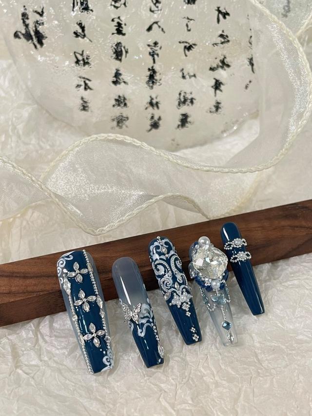 美甲师尚楚若就是从外地到东海县扎根,从事美甲设计的代表之一。与批量生产的手工穿戴甲不同,尚楚若主要承接个性化高端设计。在她设计的手工穿戴甲中,多以新中式为主。以其代表作青山黛为例,白色底胶的甲片上用不同的蓝色勾勒出青花瓷样式的图案并点缀以水钻,整副穿戴甲更像一幅艺术画。尚楚若说,这幅作品的设计灵感来自清汉女服饰,运用了服饰中的缘饰的形制和服饰中的刺绣纹样。这款作品在社交平台上发布后,也受到了关注。