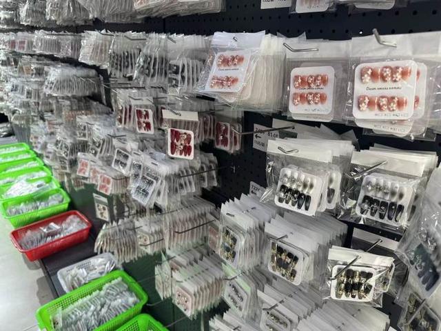 在每家门店中都有前来选品的线上、线下经销商。在发展经销商方面,东海的穿戴甲公司还可以提供一件代发服务。晶诚美甲超级工厂负责人颜伟表示,一般和他们合作的电商端经销商都不需要大量囤货,双方建立合作关系后,会将经销商网点链接至其公司的系统平台中,客户在网店下单后,公司后方会收到下单信息,仓库工作人员会根据订单顺序进行打包发货,前端经销商只需要做好网店产品链接维护和客服回复的工作,不需要为发货、售后操心。