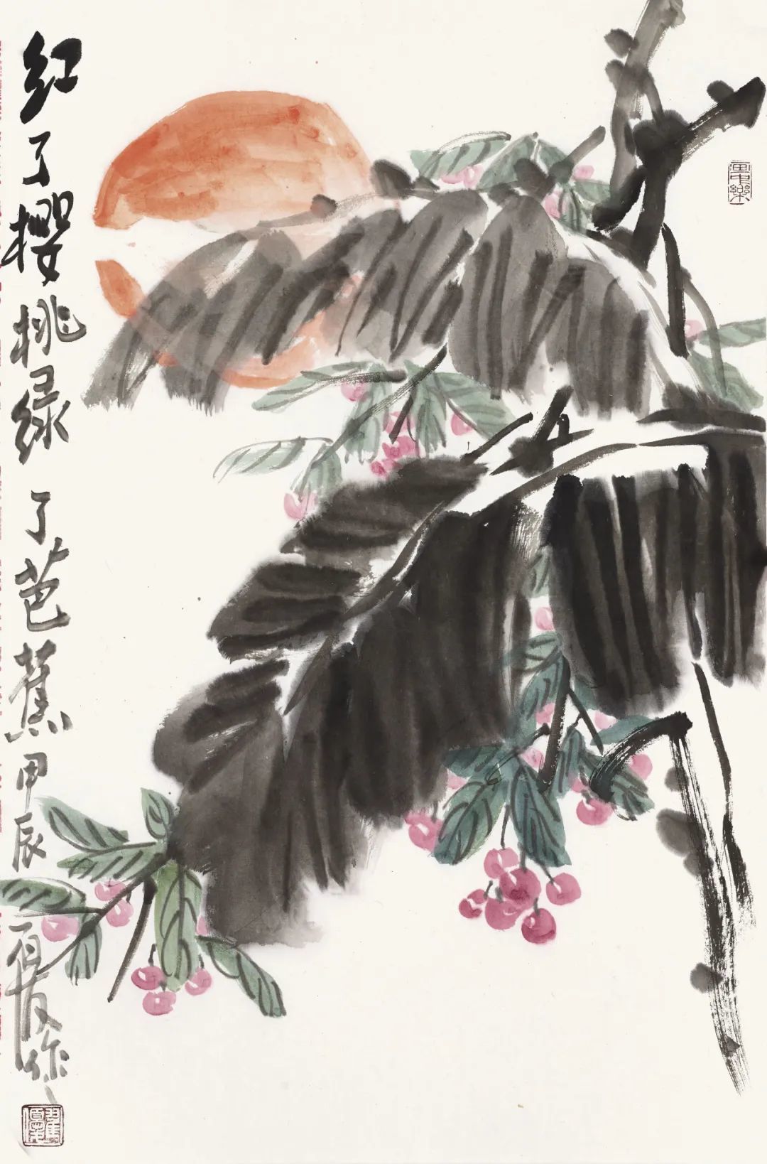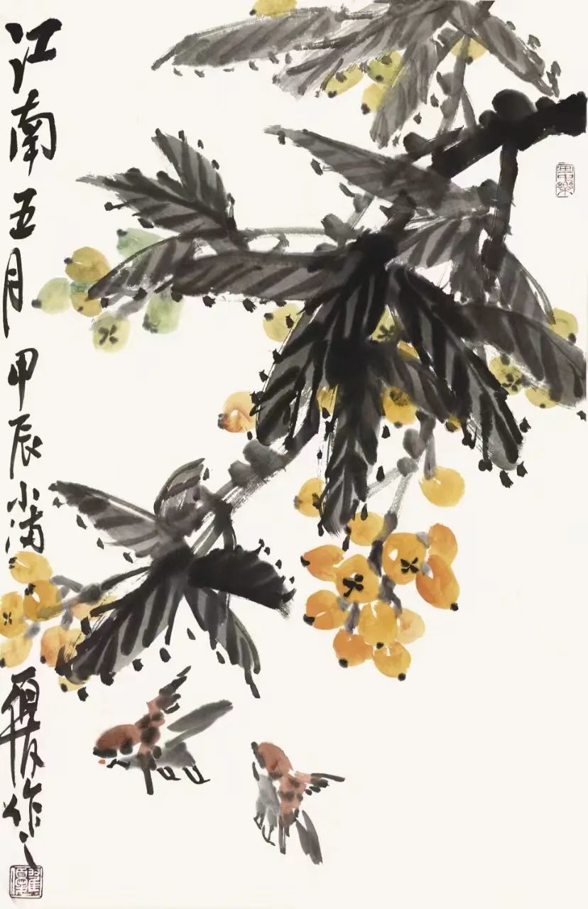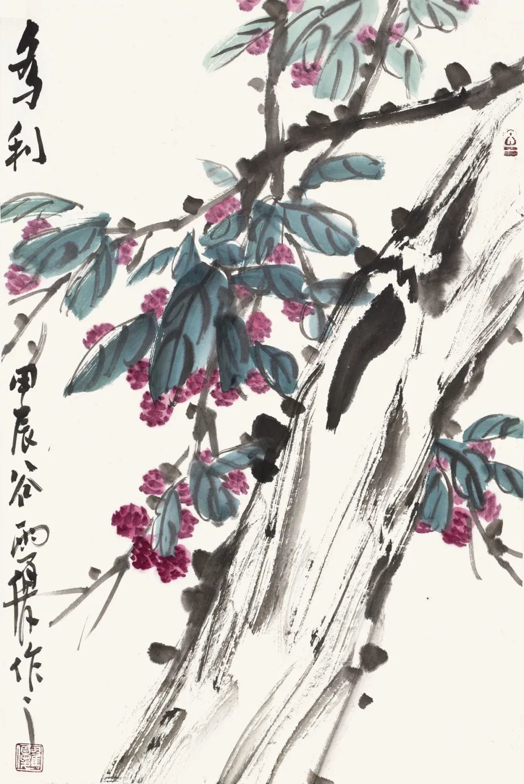 翟优生于汉高祖刘邦故里——徐州沛县,家乡厚重的历史文化,使他养成了豁达开阔的胸襟,形成了激情豪放的艺术风格。他的作品富有金石味,线条刚劲凝练、涩拙厚重,仿佛蕴含着千钧之力。他能够娴熟运用水墨枯湿浓淡的变化技巧,善于营造具有强烈冲击力的视觉效果和丰富的的画面层次。作品《多利》,用枯笔飞白疾速扫出树干,浓墨点苔出树的疤痕和斑驳的树皮,顿显“润含春雨,干裂秋风”的艺术效果,将南国荔枝树在生长过程中,不畏暴雨狂风,电闪雷击,坚韧不拔的精神气质展现的淋漓尽致。花青画叶,浓墨勾筋,变化有致,牡丹红点出的颗颗荔枝鲜果,掩映于树叶之间,让人垂涎欲滴,不禁想起苏轼的名句“日啖荔枝三百颗,不辞长作岭南人”。