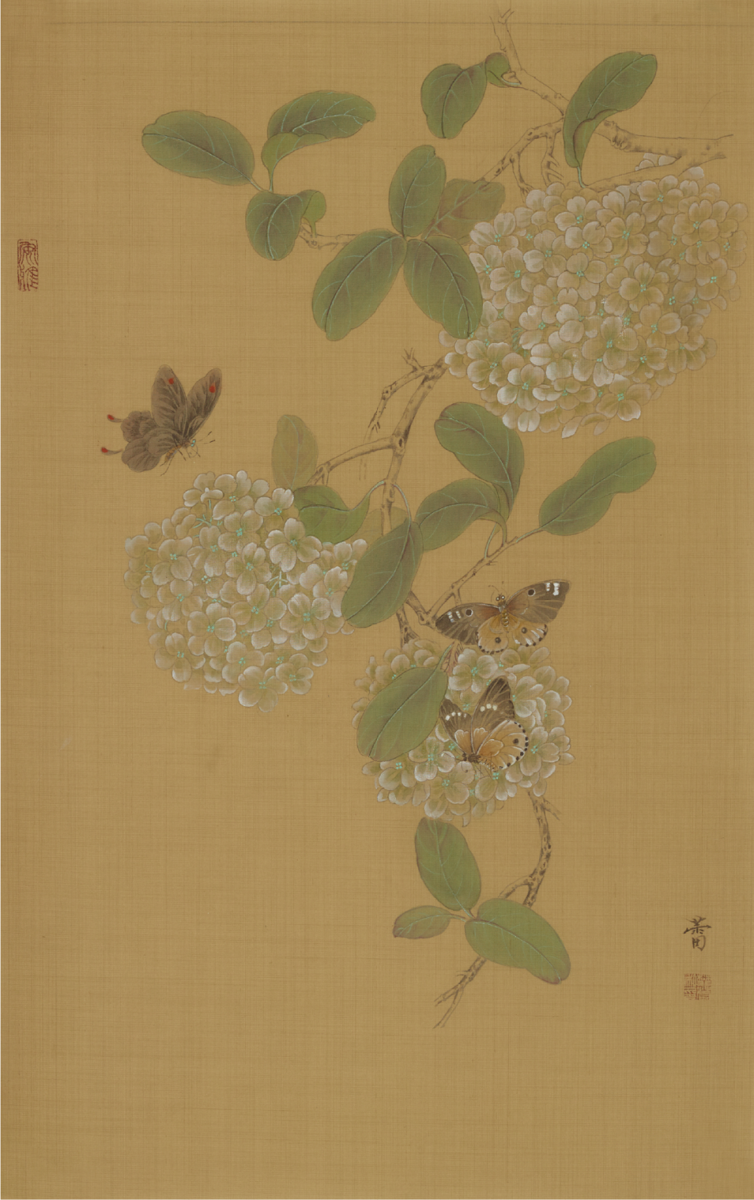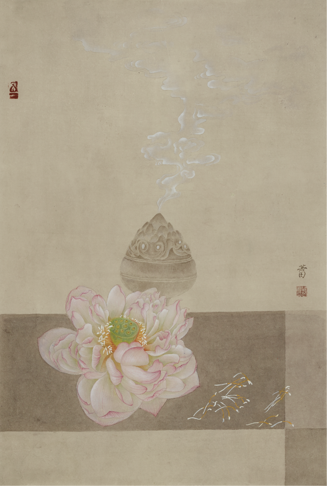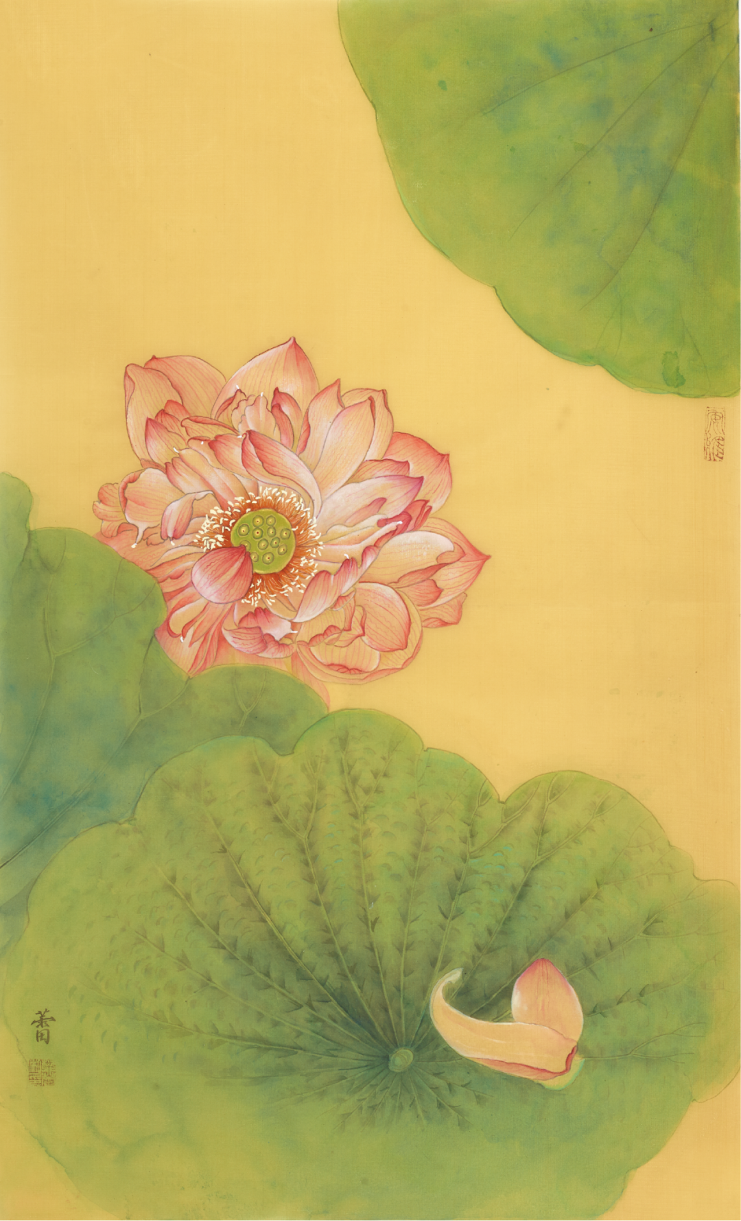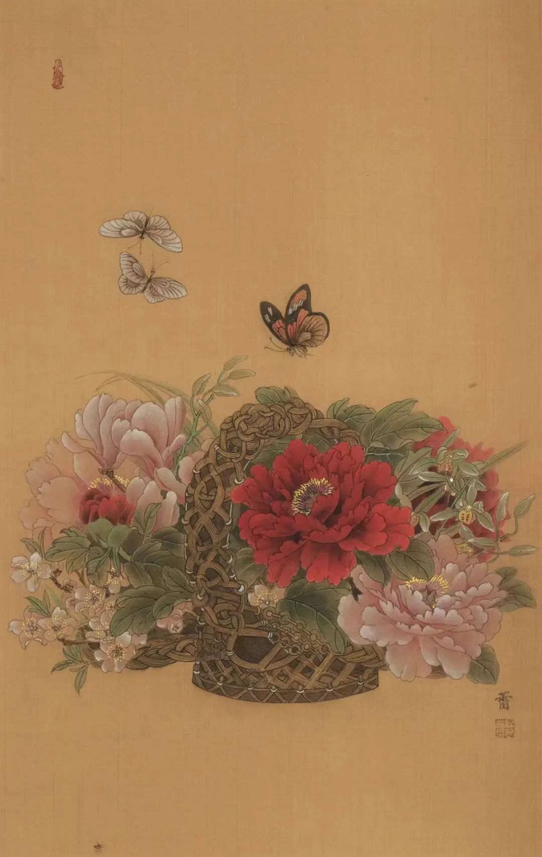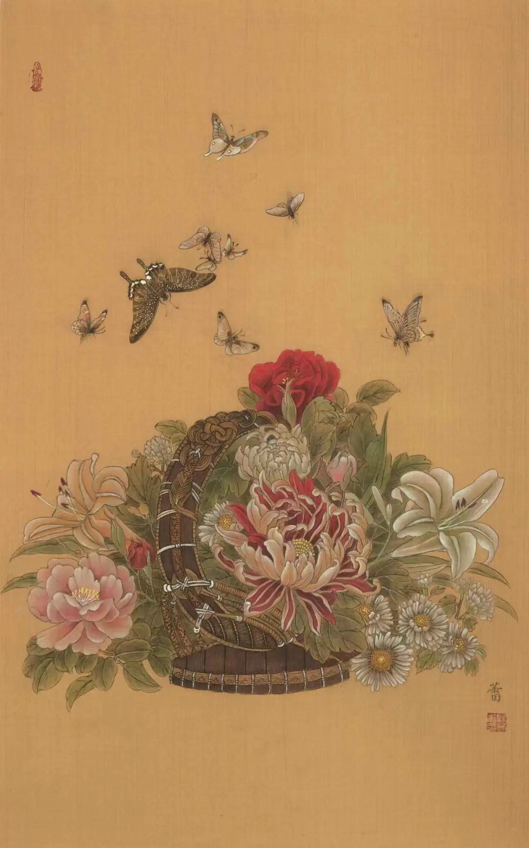樊蕾女士是一位极具个人风格的画家。其人清秀婉约,其作品清新典雅。她的作品吸收了宋代工笔画的精髓,力求工整、细腻、严谨,体现了精细不苟的审物精神和借物抒情的诗意表现。她的《花蓝图》,取意宋画,构图饱满。提篮里装有数种鲜花,几只蝴蝶翩然舞其上。所画花卉蝴蝶均以中锋用笔,勾出如“春蚕吐丝”般细腻工致的线条,敷以清新雅致的色彩,展现了艺术家对各种花卉蝴蝶细致入微观察力和高超的艺术表现力。同时,花卉之清亮明艳与竹篮和绿叶之暗色形成色彩对比。花卉的静止与舞动的蝴蝶之间形成了动静对比。一明一暗,一动一静,画面顿显生机勃勃。《花蓝图》中荷花、牡丹、芍药、百合等花卉都是艺术家精心挑选,象征着和平、富贵、浪漫、友谊等吉祥寓意,为作品增添了浓郁的中国文化底蕴。