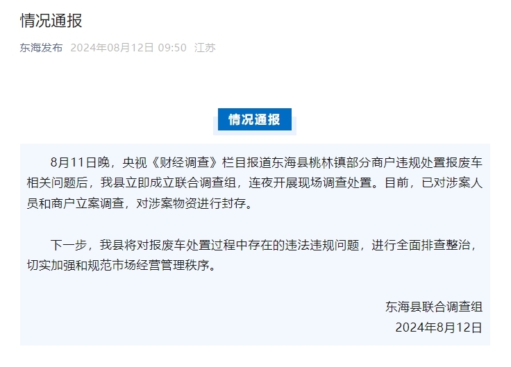 东海县联合调查组称,8月11日晚,央视《财经调查》栏目报道东海县桃林镇部分商户违规处置报废车相关问题后,该县立即成立联合调查组,连夜开展现场调查处置。目前,已对涉案人员和商户立案调查,对涉案物资进行封存。