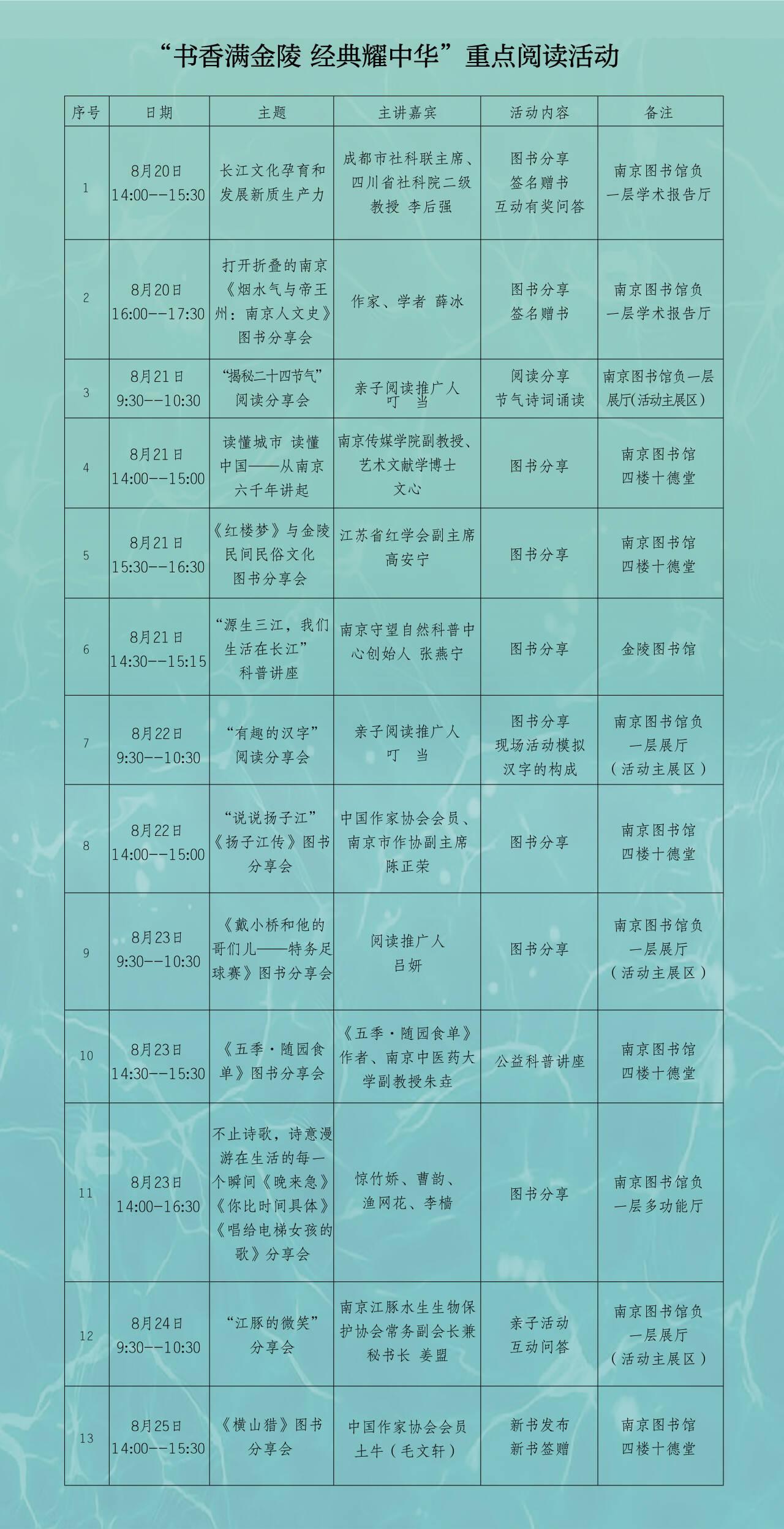 为了让中华优秀传统文化更好地衔接当下,引导读者爱读书、读好书、善读书,“书香满金陵 经典耀中华”系列活动将发布“‘典’亮成长之路”南京市中小学生中华优秀传统文化经典阅读指导目录、第五届青春好书榜、南京都市圈馆读共荐书单。