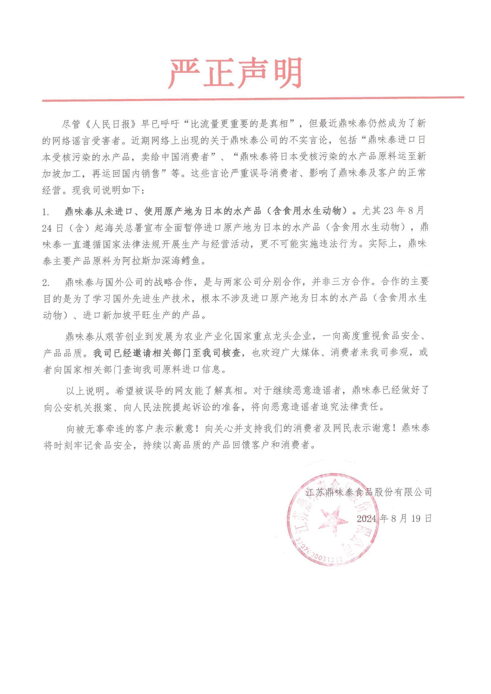 鼎味泰提供的声明回应。