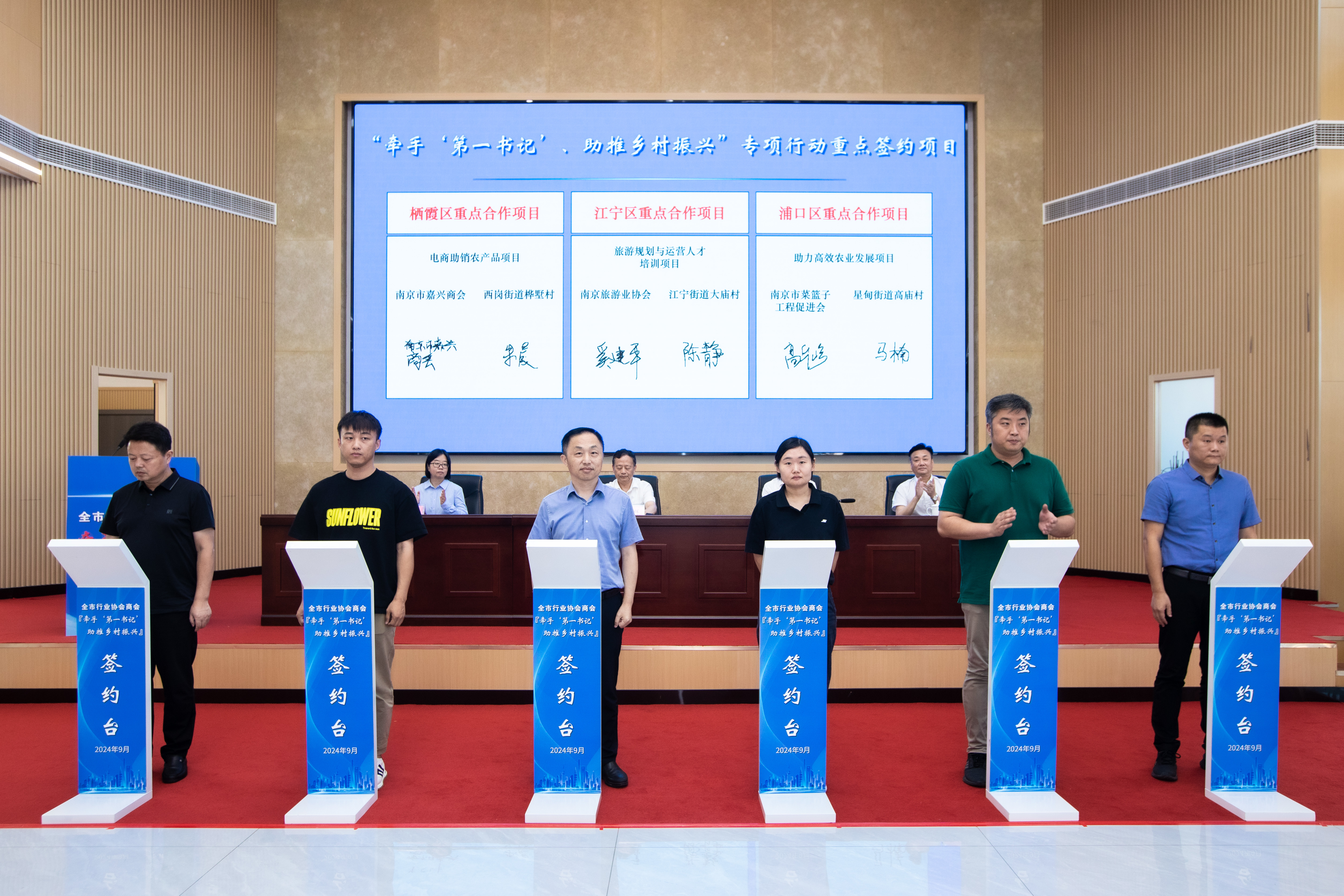 会上,部署南京市行业协会商会“牵手‘第一书记’,助推乡村振兴”专项行动,并举行启动仪式。6家全市性行业协会商会代表与6位驻社区(村)“第一书记”、党组织代表进行现场签约;南京市商务局、市工商联分别为六合区特色电商培训中心和乡土文创研学中心揭牌;南京市六合区、市农业农村局、市工商联、市总商会、南京电子商务协会、南京旅游业协会作为代表分别作了交流发言,为专项行动提供了宝贵经验和启发。