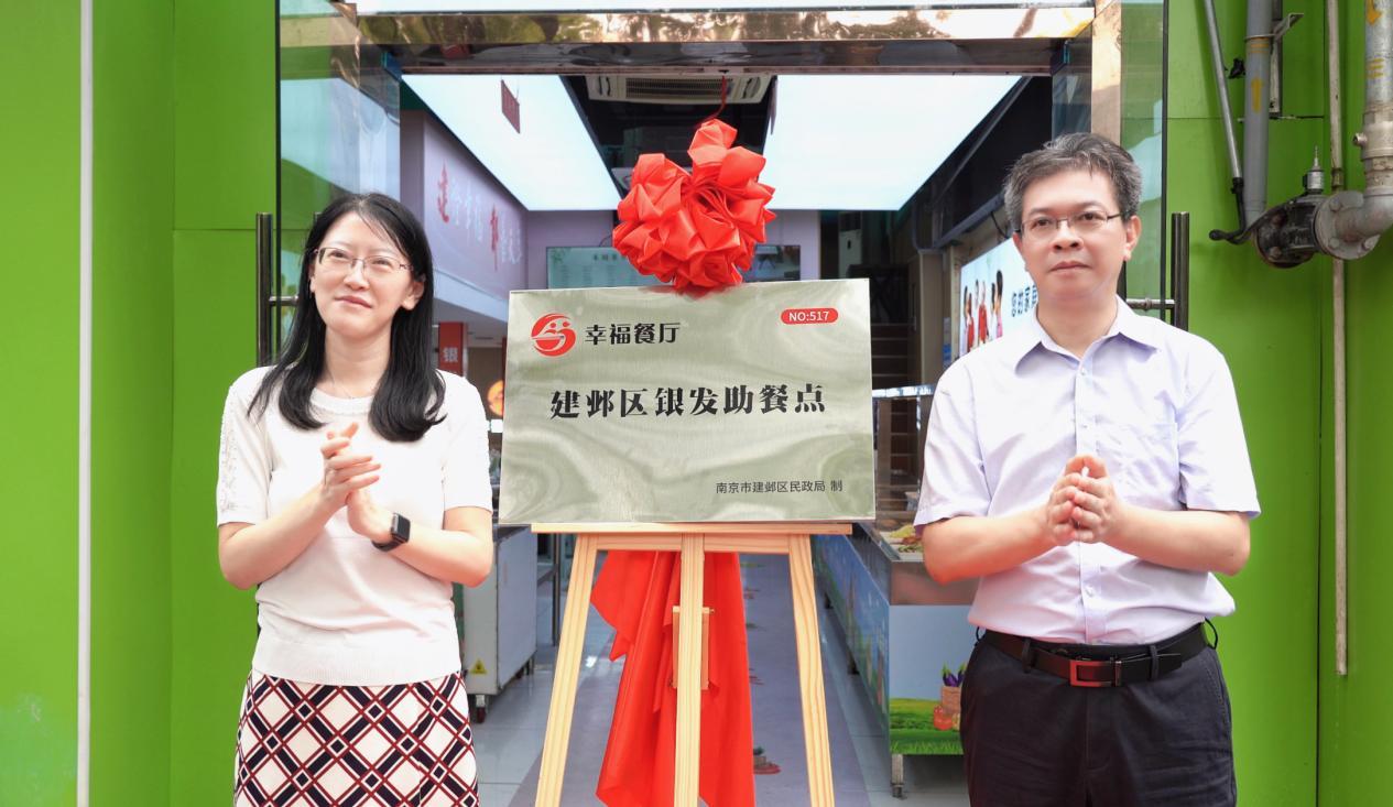 建邺区民政局局长邱文标与沙洲街道党工委书记沈杨共同为银发助餐点揭牌。