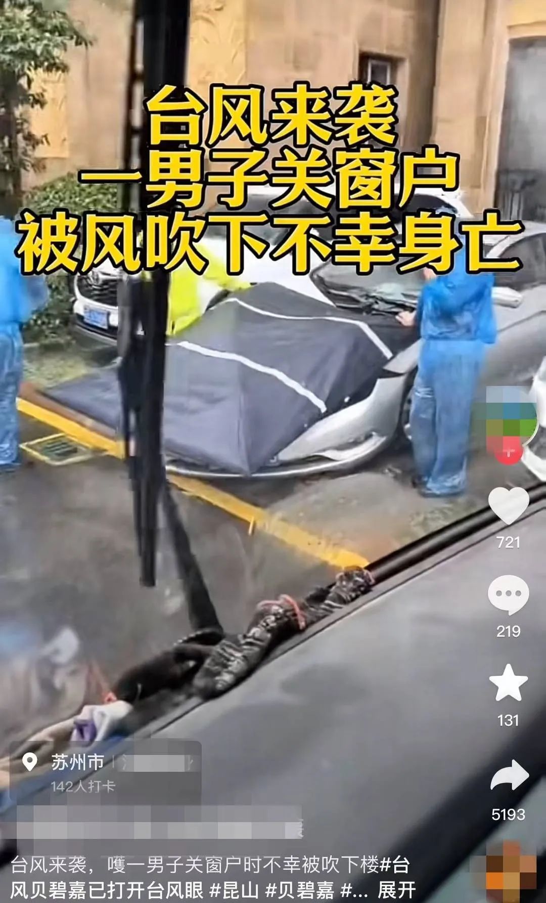 网友发布的视频显示,一男子坠落在楼下停着的车顶上,车顶被砸出一个大坑,视频配文称“台风来袭,一男子关窗户被风吹下楼不幸身亡”。另一个相关视频称当事人从22楼坠下,已不幸身亡,或因拍摄视频所致,事发地为昆山花桥棕榈湾小区。