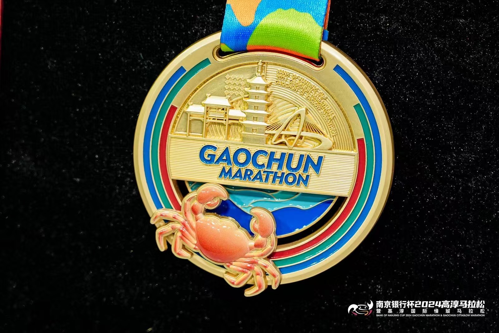奖牌设计更是独具匠心,上半部分绘有高淳知名地标建筑,下半部分交错展现慢城金秋花海与固城湖湖光。同时为突出“螃蟹马拉松”独特定位,沿用螃蟹元素,错落叠于高淳历史与自然共绘的美景之上,巧妙运用左右滑动机关设计,为奖牌整体增添一份灵动与趣味性。