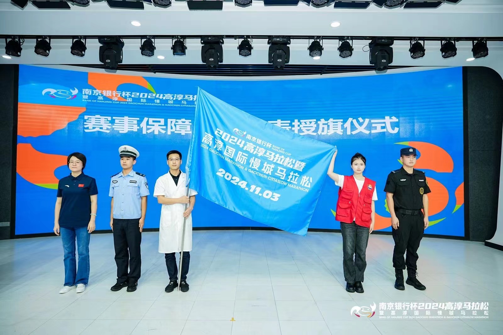 发布会现场,高淳区委常委、宣传部部长、统战部部长刘敏为赛事保障人员代表授旗,这面旗帜不仅承载着广大路跑爱好者对赛事成功举办的期许,更蕴含着赛事组委会与高马跑者对全体保障人员的认可。同时,为了感谢跑者们数年如一日的坚持与热爱,由高淳区副区长邱峰为五年跑者颁发荣誉号码布并为七届荣誉跑者授牌,跑者代表共同上台领取。