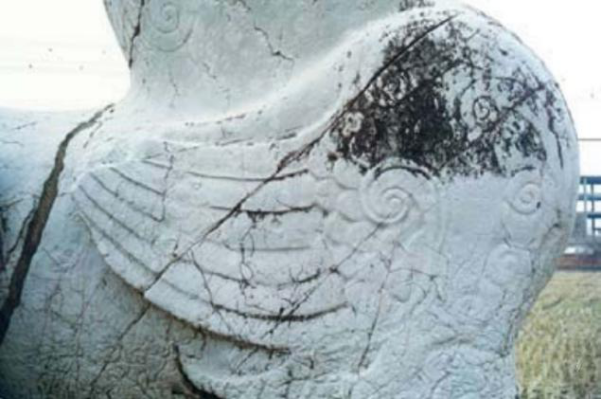 萧景墓东辟邪雕刻着意刻划了神兽口中吐出的长舌,使之长垂至前胸,望之似吞云吐雾,神秘怪诞。腹侧装饰有双翼,翼前部雕刻勾云纹,并延伸到前肢左右两侧。左翼前端反交圈如祥云一般附在前端,之后的小羽、大羽雕刻精美,在处理上强化了翅膀的装饰性和空间特征。右翼的小羽靠前,与前端小反交圈接近,小反交圈也不似左翼圆泽饱满,猜测两者的差异,徐巧慧认为可能是由于右翼前端石料崩损,或是在刻凿轮廓时剔除过多石块,只有缩小小羽和前端反交圈的距离来保证大羽的长度。