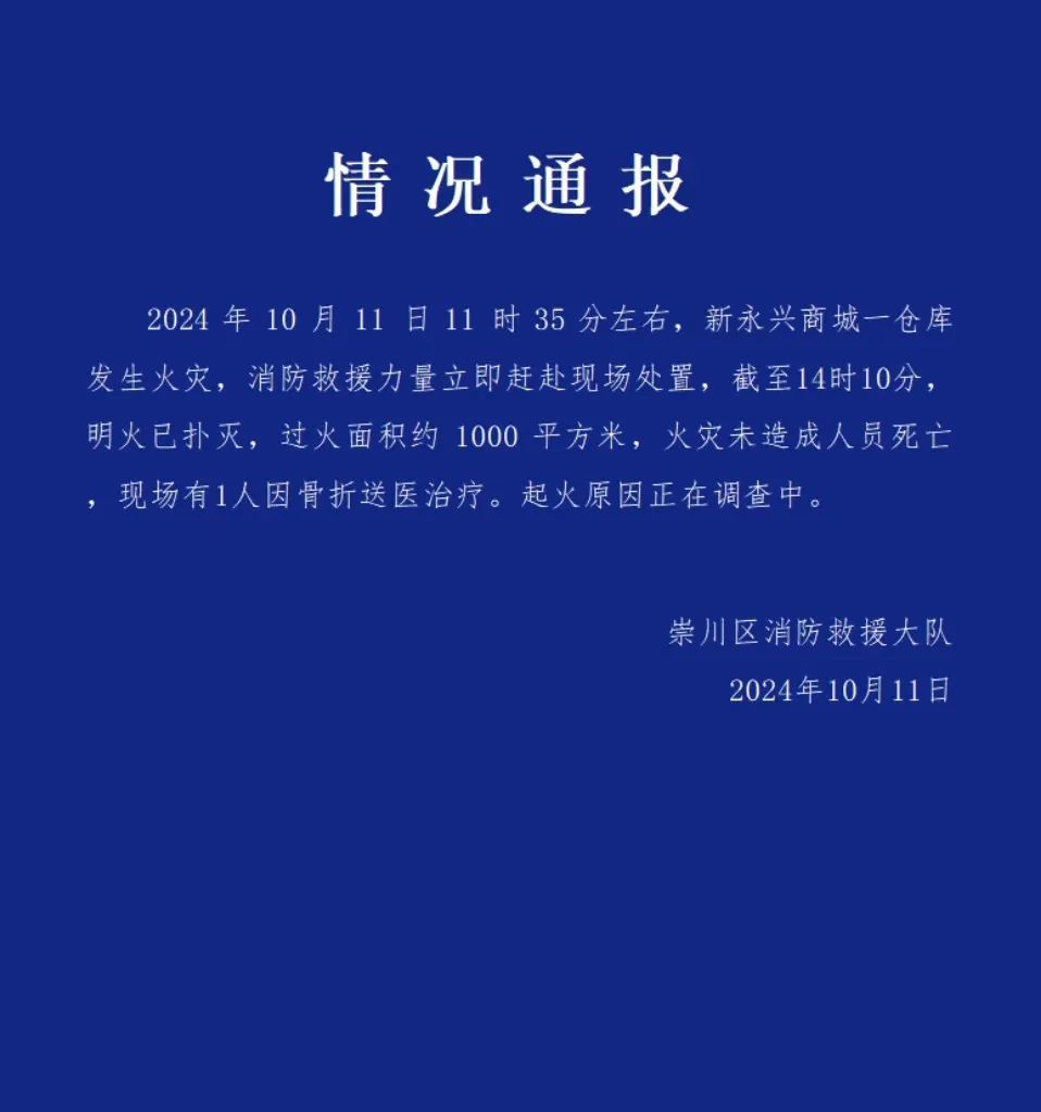 10月11日下午,南通市崇川区消防救援大队发布情况通报,当日11时 35分左右,新永兴商城一仓库发生火灾。截至14时10分,明火已扑灭,过火面积约1000平方米,火灾未造成人员死亡,现场有1人因骨折送医治疗。