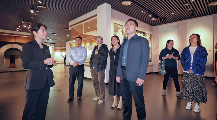 跟随讲解员步伐,按照宜兴发展脉络,采风团一行在通史馆观览各个历史时期的奇珍异宝:新石器时代的良渚文化玉琮,通体呈圆柱形,器形规整、雕琢细致;唐代海兽葡萄镜纹饰错落有序,瑞兽珍禽与葡萄枝蔓相互映衬;宋代漆盒如黑玉般温润,对称十六瓣形尽显典雅大方;明代犀牛角杯表面深琥珀色,包浆润泽,梅花纹饰细腻繁密。还有新四军苏浙军区政治部通告,是我党我军战争年代重视保护文化古迹的有力佐证……诸多文物或汇聚匠人智慧技艺,或凝结文人审美情趣,或极具历史文化价值,宛若璀璨群星,在宜兴这片历史厚重、文化氤氲的土地上熠熠生辉,令所有人叹为观止、表示不虚此行。