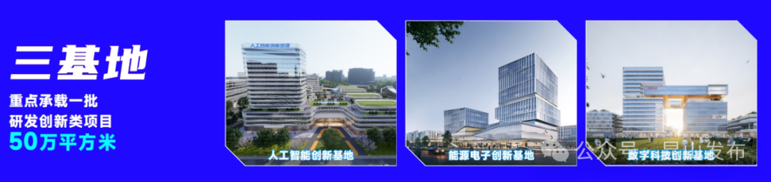 “三基地”是指总建筑面积近50万平方米的人工智能创新基地、能源电子创新基地、数字科技创新基地,重点承载一批研发创新类项目。