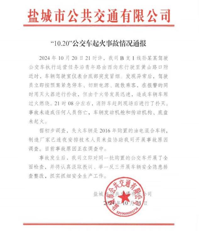 据初步调查,失火车辆是2016年购置的油电混合车辆,制造厂家已连夜安排技术人员来盐协助盐城市公共交通有限公司开展事故原因调查。目前事故原因正在调查中。