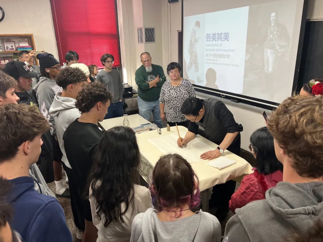 教学现场,高云会长为师生们深入浅出地就中国画和油画的各自特点进行了比较,重点解析介绍了中国画艺术,为了强化听课者对中国画语言及中国画材料工具的直观感受,高云会长边讲解边创作,全过程展示了一幅中国画作品诞生。该作题为《音清和雅》,以期表达以艺术促进中美民间文化交流,增进双方友谊的美好愿望。