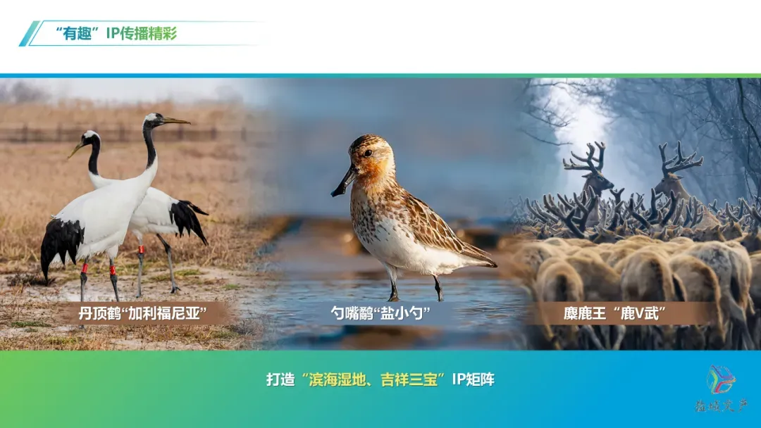 盐城打造“滨海湿地、吉祥三宝”IP矩阵,讲好丹顶鹤“加利福尼亚”、勺嘴鹬“盐小勺”、麋鹿王“鹿V武”的生动故事。