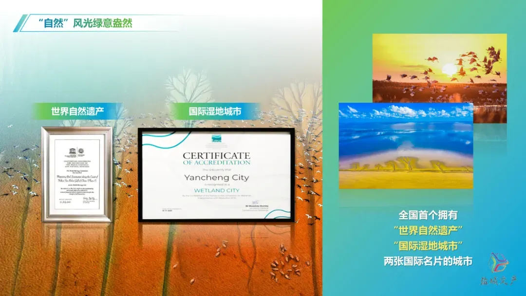 盐城是全国首个同时拥有“世界自然遗产”“国际湿地城市”两张国际名片的城市,我们加快建设绿色低碳发展示范区,全力打造世界级滨海生态旅游廊道。2023年成功举办全球滨海论坛会议。