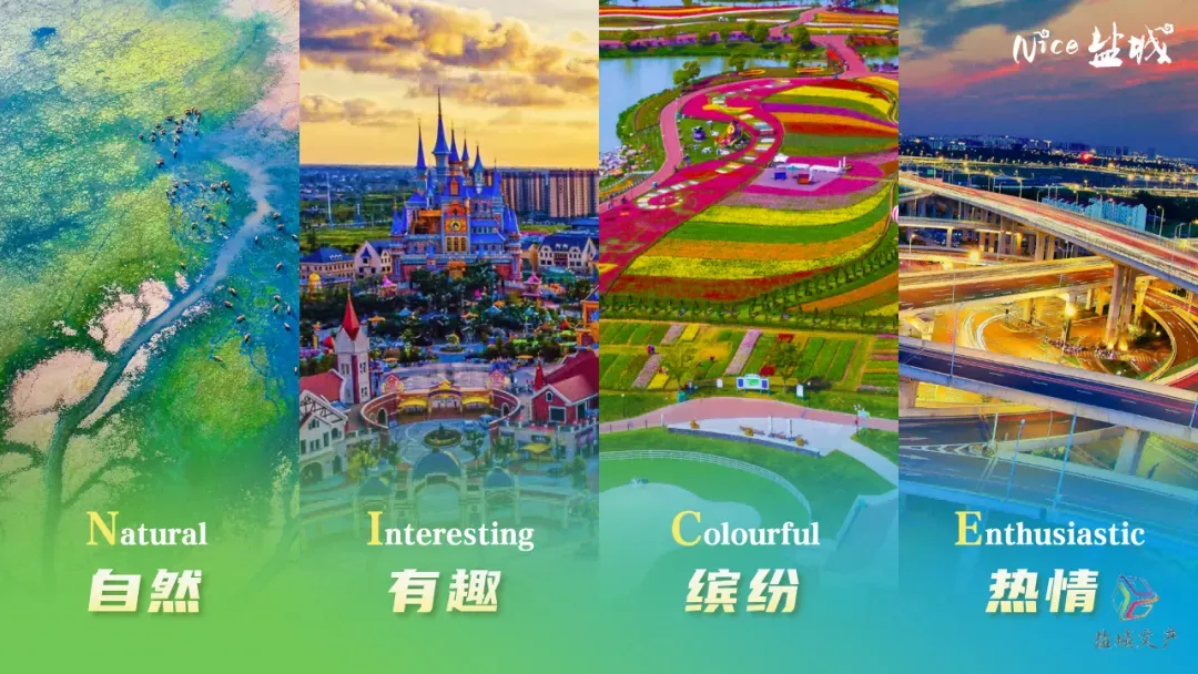 盐城以“一个让人打开心扉的地方”城市宣传语为引领,持续做优“自然(Natural)、有趣(Interesting)、缤纷(Colorful)、热情(Enthusiastic)”的“NICE盐城”城市标签。