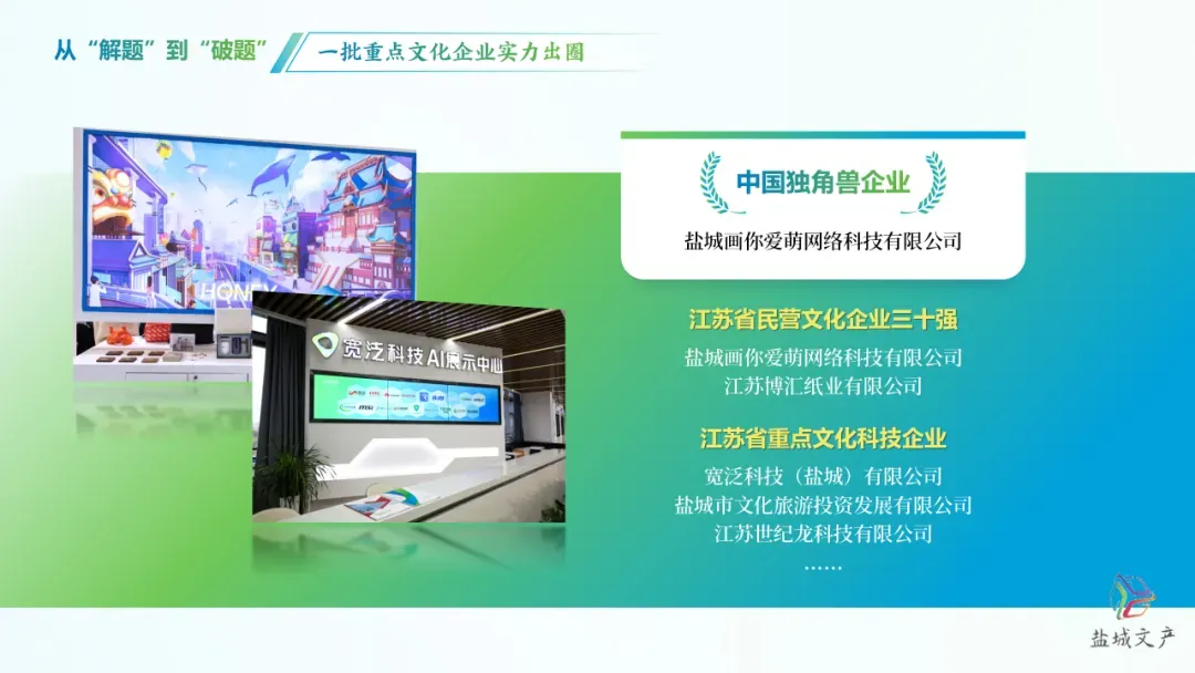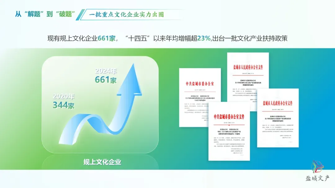 近年来,我市深入实施文化产业“六个一”工程,持续叫响“盐城街有你”、“金海贝”文创大赛等品牌,聚力打造文化赋能高质量发展示范区。 ●从“解题”到“破题”,一批重点文化企业实力出圈。 全市现有规上文化企业661家,十四五以来年均增幅超23%。出台一批文化产业扶持政策,20多家文化企业分获中国独角兽企业、江苏省民营文化企业30强、江苏省重点文化科技企业等荣誉。