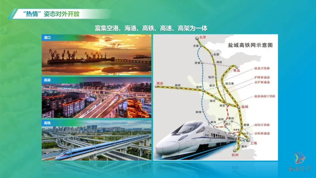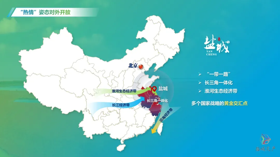 盐城位于“一带一路”、长三角一体化、淮河生态经济带等多个国家战略的黄金交汇点,富集空港、海港、高铁、高速、高架为一体,发展前景广阔、势头强劲。