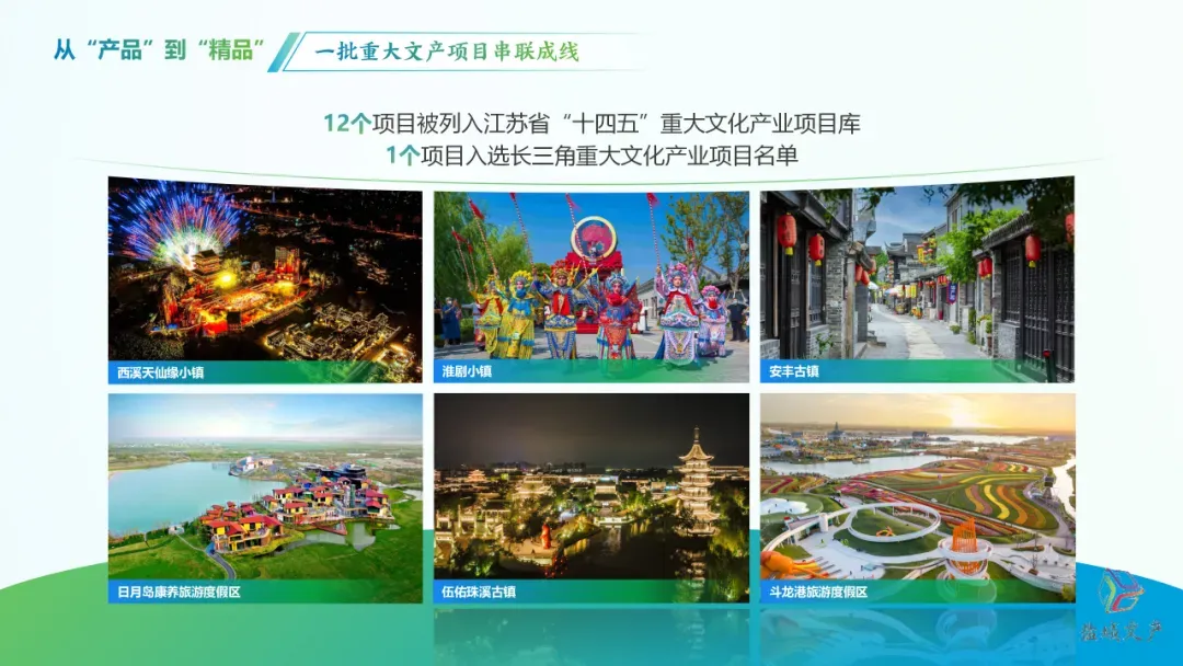 淮剧小镇等12个项目列入江苏省“十四五”重大文化产业项目库,1个项目入选长三角重大文化产业项目名单。在我们持续推进“串场河海盐历史文化长廊”“湿地盐城·生态文旅融合示范带”建设中,期待有更多“新业态、新场景、新模式”的文化项目亮相“一廊一带”。