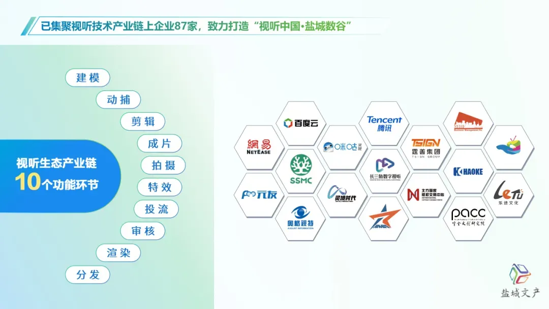 依托盐城数字经济强引擎和算力强基础,打造长三角(盐城)数字视听产业基地,为数字文化人才提供创新创业空间,已集聚视听技术产业链上企业87家,形成集建模、拍摄、剪辑、投流等功能于一体的视听生态全产业链,致力打造“视听中国·盐城数谷”。