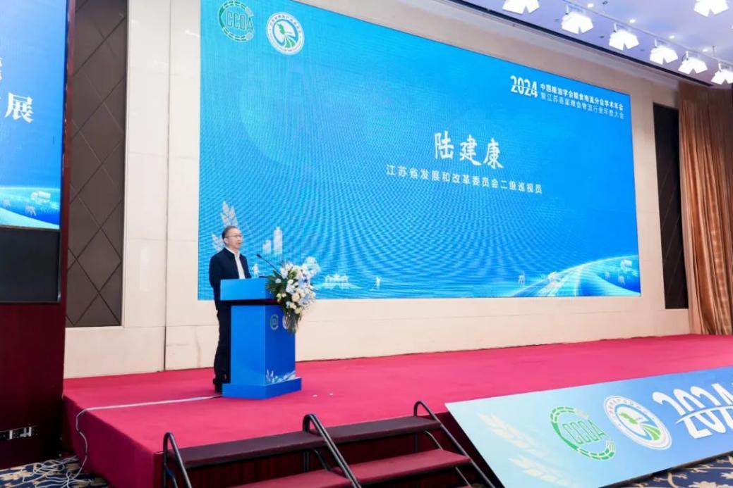 江苏省发展和改革委员会二级巡视员陆建康致辞。他说,近年来,省发展改革委高度重视粮食安全和粮食物流的发展。聚焦建强枢纽,加快推进苏州、连云港、盐城、泰州4个粮食物流核心枢纽和28个粮食物流关键节点建设。聚焦织网强链,统筹布局“三横四纵”粮食物流骨干网络和粮食物流枢纽节点,推进粮食产购储加销全链条协同发力;推进重点粮食物流园区和企业的整合,推动粮食物流枢纽节点的业务协同、网络互联;大力发展粮食“公、铁、水”多式联运,打造高效便捷的粮食多式联运体系。