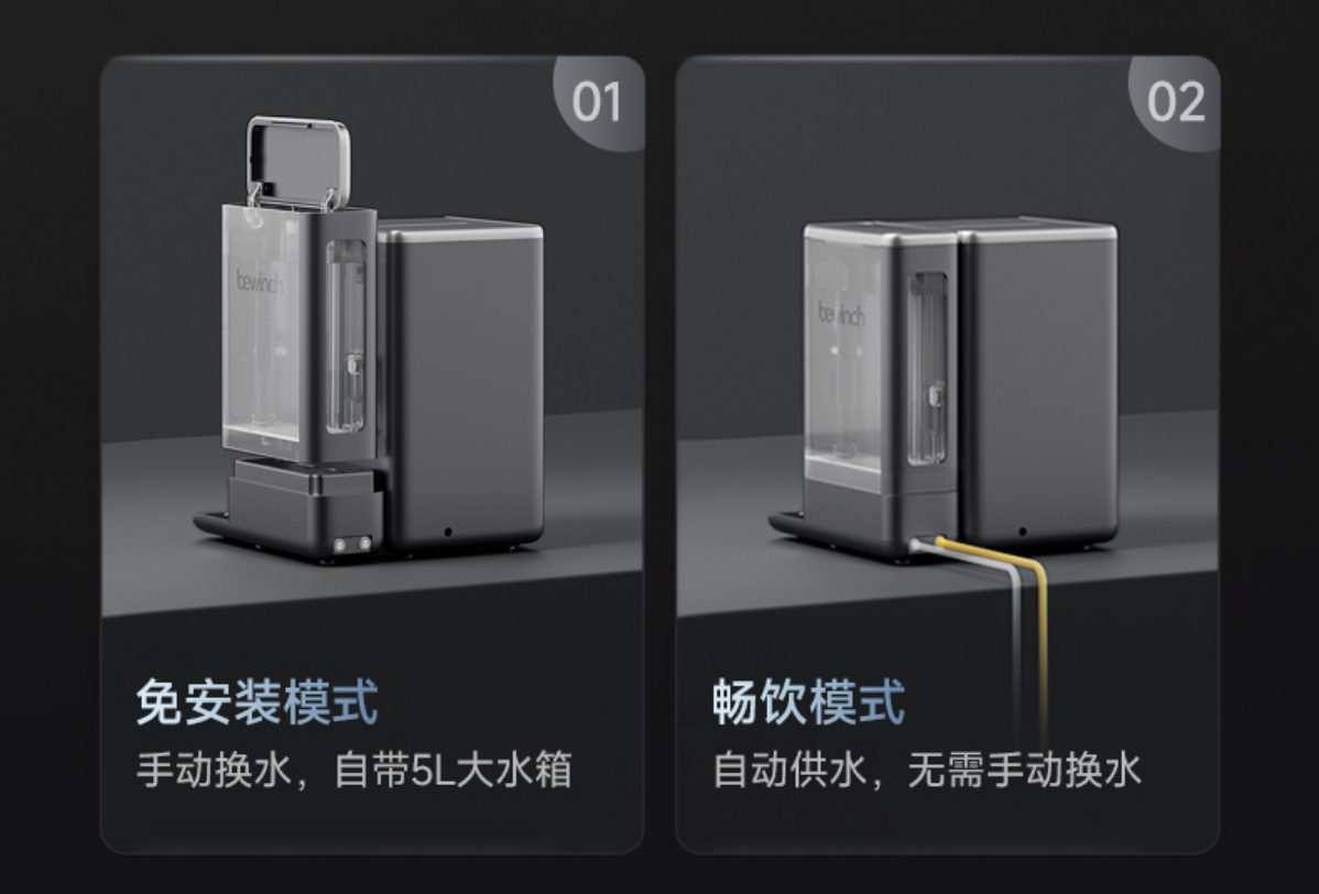 ● 台式净水器:自带水箱免安装、通电即用,卧室、客厅、书房均可随心放置,水质选择与个性功能更多,但缺点是自带水箱在用水频繁时换水较为麻烦等。