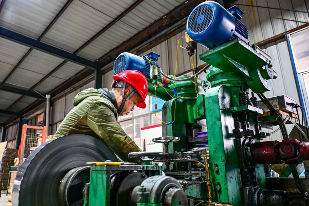 车间里机器轰鸣,工人们精神焕发,干劲满满,整个车间一片红红火火的生产场景。该公司专注于特定热能转换装置及高电阻电热合金的研发、生产和销售。