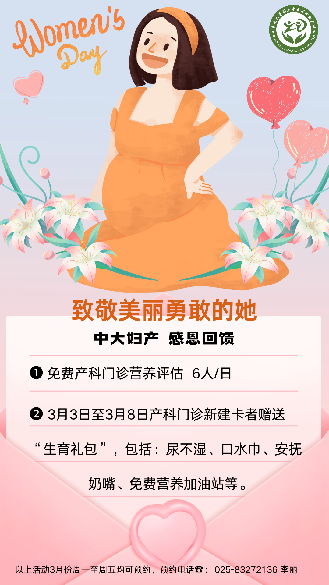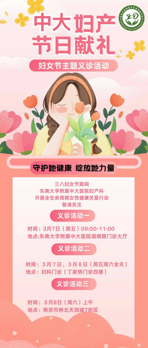 3月7日上午9:00至11:00,中大医院妇产科团队在东南大学附属中大医院湖南路门诊大厅,举行女性全生命周期的健康咨询。同时,3月7日和3月8日,在中大医院丁家桥院区门诊四楼妇科普通门诊,妇产科团队将为广大女性朋友进行健康指导,给出妇科疾病专业治疗建议。