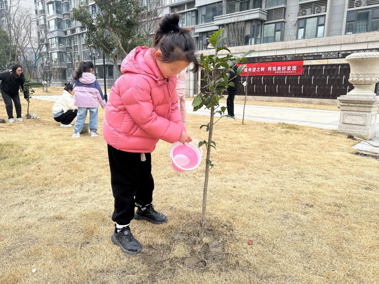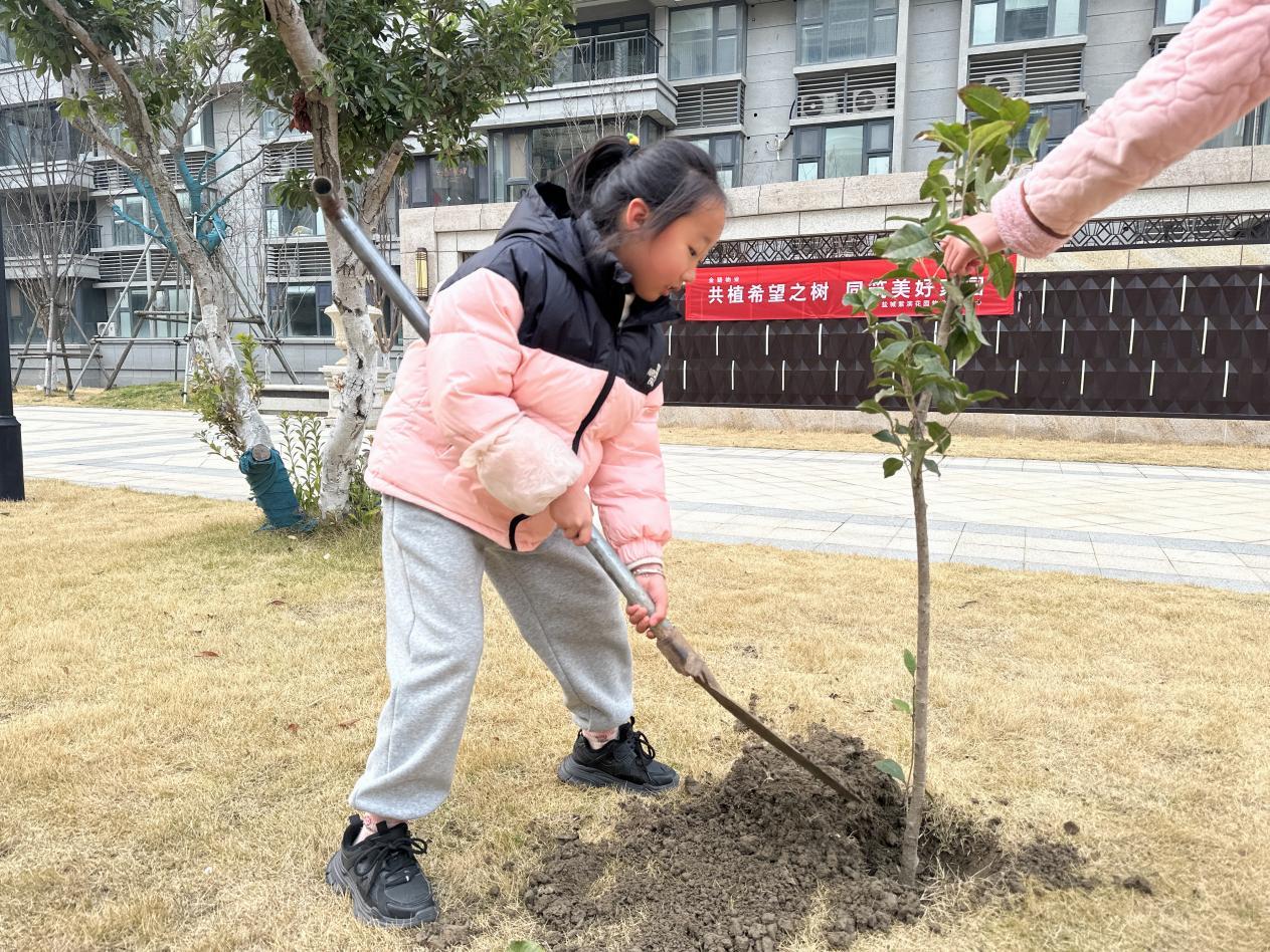 每一棵树苗种下后,孩子们都会精心地挂上自己亲手制作的心愿卡。卡片上,有的画着美丽的家园,有的写着对未来的美好憧憬。“希望小树苗快快长大,为我们的社区遮风挡雨。”“愿我们的社区永远充满绿色和生机。”这些质朴而纯真的话语,如同春日里最温暖的阳光,照亮了每个人的心田。