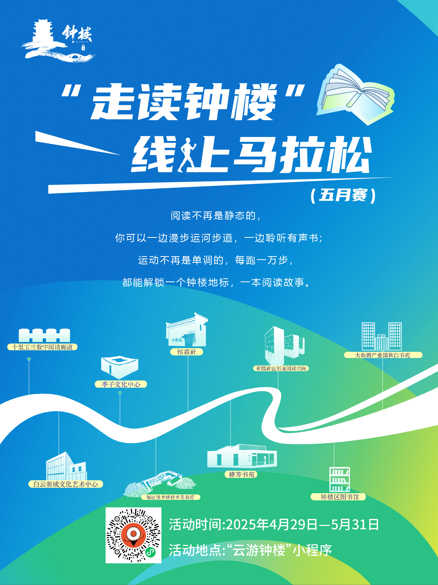 市民朋友通过扫描“云游钟楼”微信小程序就可以积攒微信运动步数换算行进距离,依次点亮9个“走读钟楼”数字阅读“地标”,就能解锁有声阅读礼包和相关奖品。这一创新举措将阅读与运动巧妙结合,让阅读成为了一种全新的生活方式。