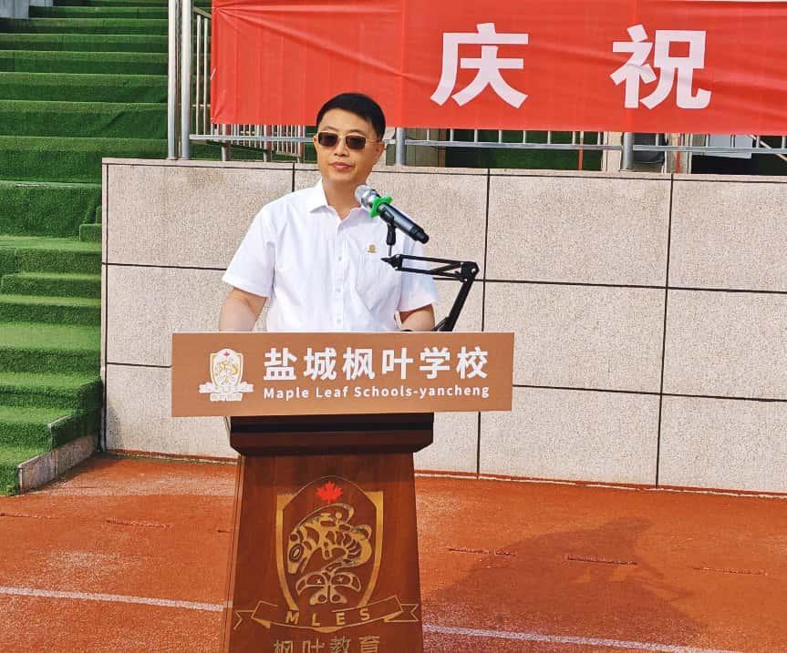 盐城校区总校长郭宗雨先生发表致辞,向枫叶教育集团送上诚挚祝福与崇高敬意。郭校长带领师生共同回顾集团发展历程:从1995年大连14名学生开启枫叶教育探索之路,到如今成长为国际化教育标杆,成功研发枫叶世界学校课程。同时,他详细介绍了盐城校区自2017年成立以来,依托"四精工程""三自教育"体系,凭借精细管理、双语教学、多元发展取得的优异成绩。郭校长寄语全体教师坚守育人初心、提升专业素养、传承枫叶文化;鼓励同学们志存高远、勤奋学习、全面发展,以优异成绩为集团30周年献礼,携手迈向"标新百年",为教育强国建设贡献力量。