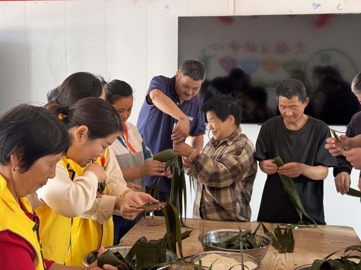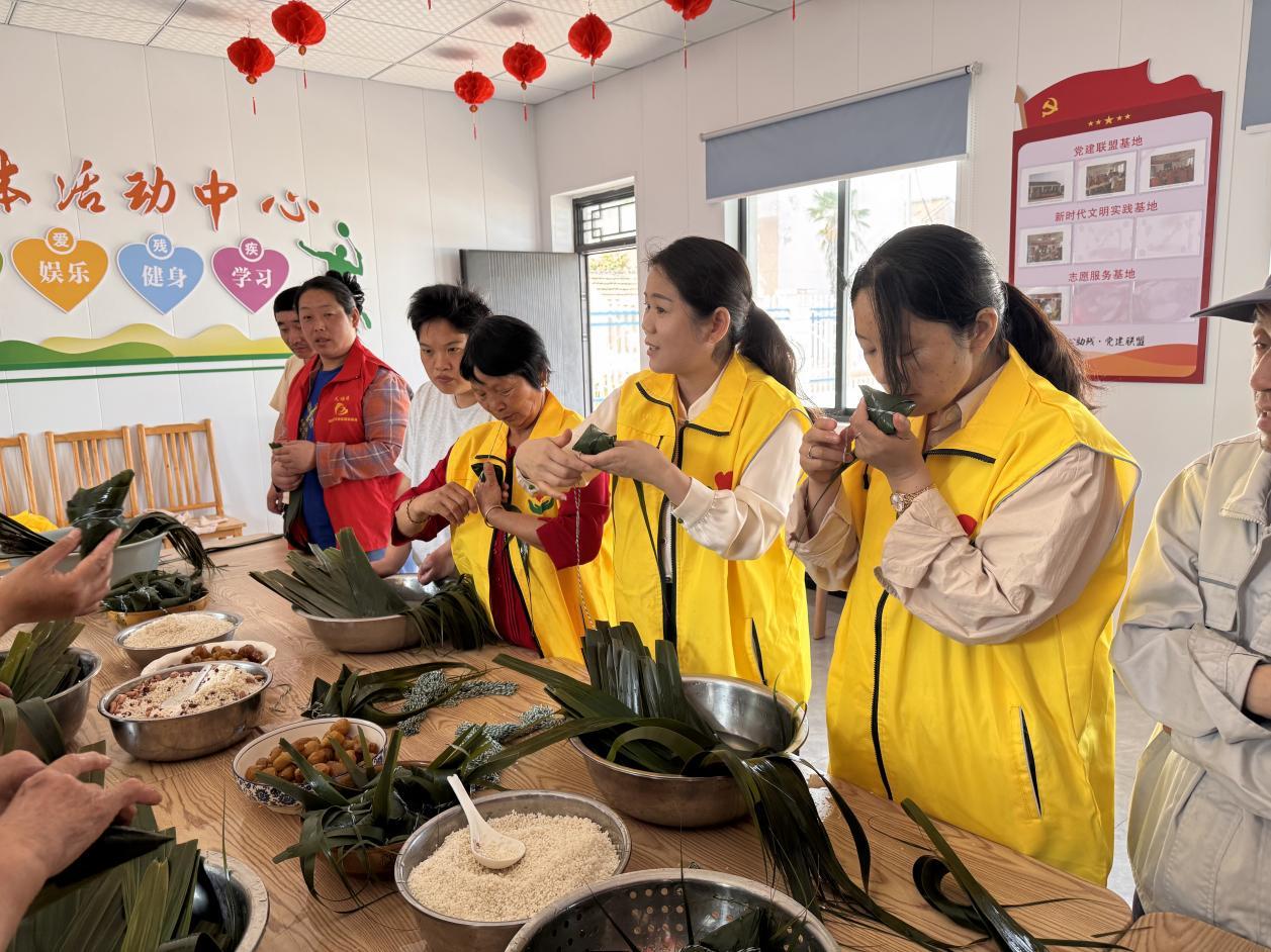 大家围坐在一起,手法娴熟地将粽叶卷成漏斗状,填米、压实、捆扎,不一会儿,一个个饱满的粽子便堆成了“小山”。活动中,志愿者们还热情分享包粽子的技巧和生活中的趣事,欢声笑语中传递着邻里温情。