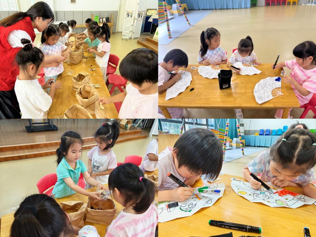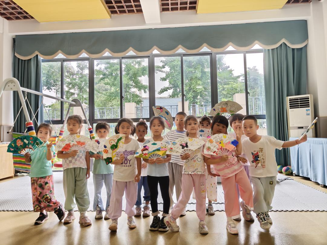 折扇制作环节同样热闹非凡。孩子们发挥自己的想象力和创造力,用彩笔在扇面上绘制出一幅幅色彩斑斓的夏日画卷:有的画了蓝天白云下的绿树,有的画了池塘里盛开的荷花,还有的画了在草地上玩耍的小动物……每一把折扇都独具匠心,充满了童真童趣。