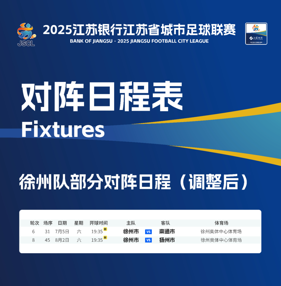 为提升球迷观赛体验,经徐州赛区申请及相关队伍同意,组委会研究决定,同意调整第六轮第31场徐州队对阵南通队、第八轮第45场徐州队对阵扬州队的比赛开球时间至19:35,比赛日期及比赛场地不变。