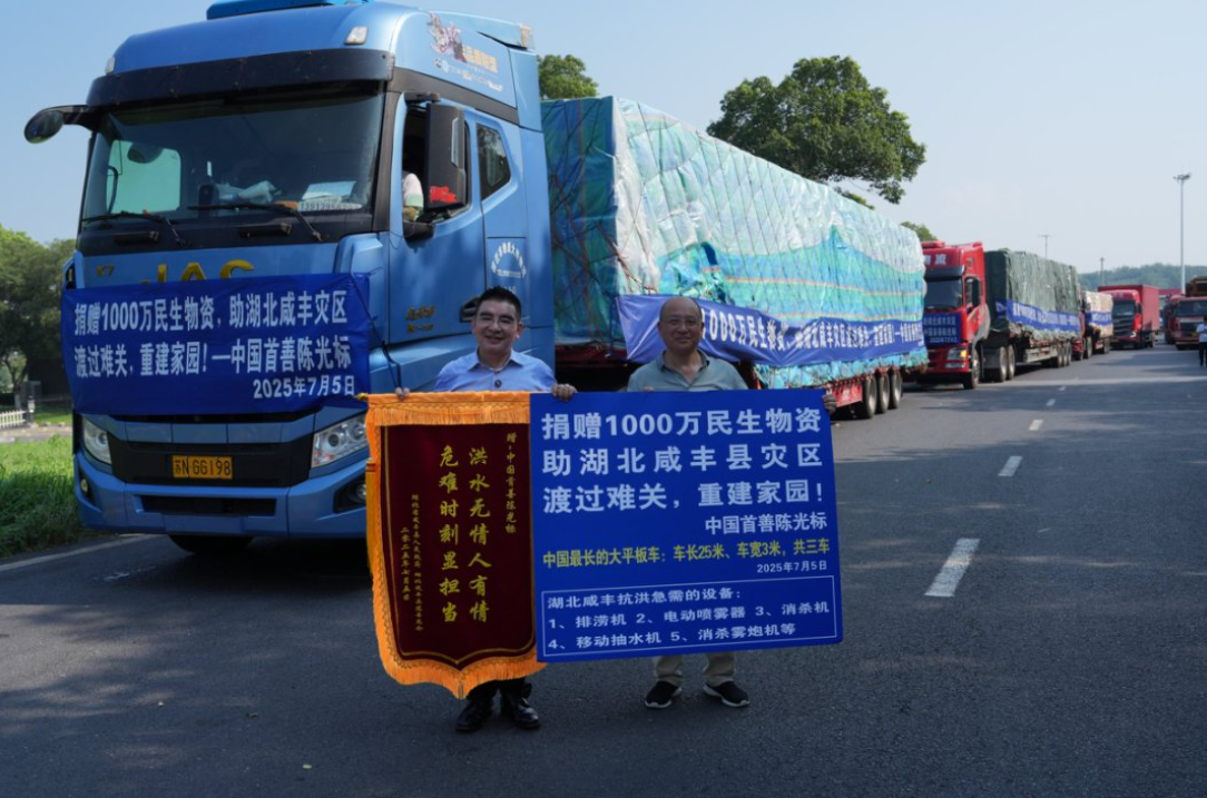 灾情牵动社会各界。7月6日,全国道德模范、“中国首善”陈光标紧急调配的1000万元民生物资正式发车,助力咸丰灾区渡过难关、重建家园。此次捐赠物资聚焦抗洪急需设备,包括排涝机、电动喷雾器、消杀机、移动抽水机、消杀炮机等,均为灾后排涝、环境消杀及卫生防疫的关键设备。