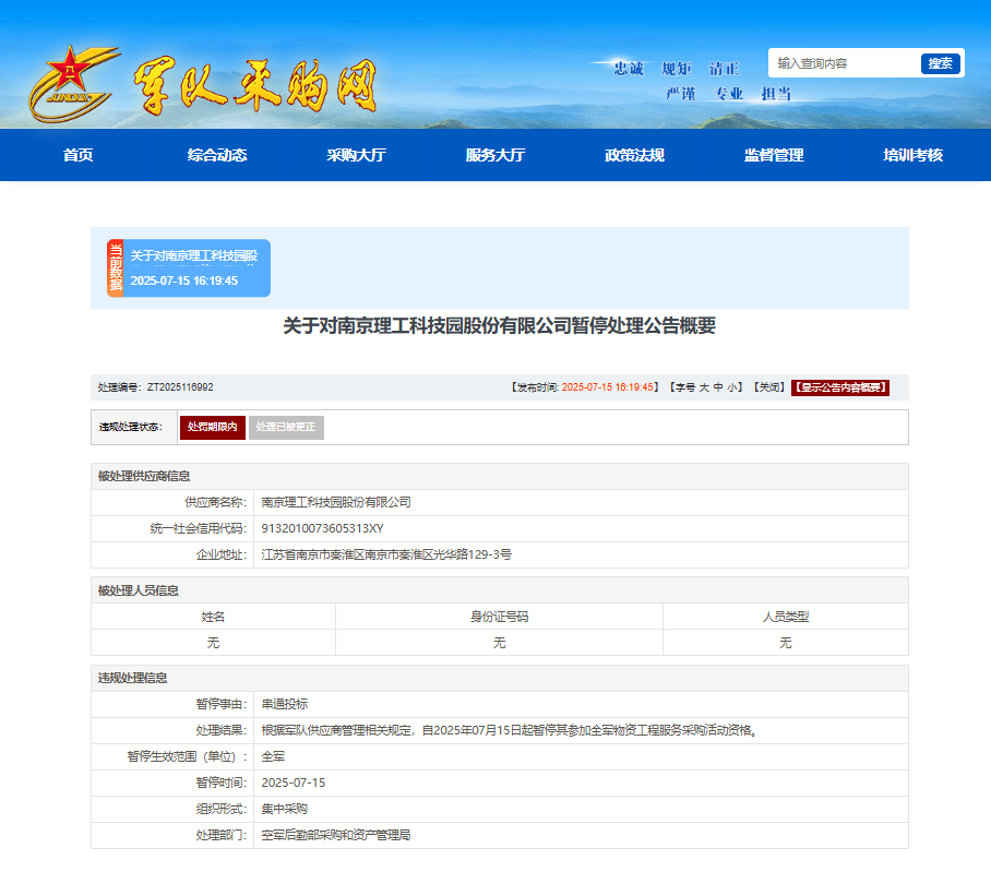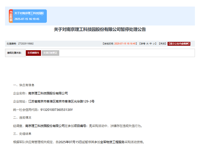 近日,军队采购网发布关于对南京理工科技园股份有限公司暂停处理公告。