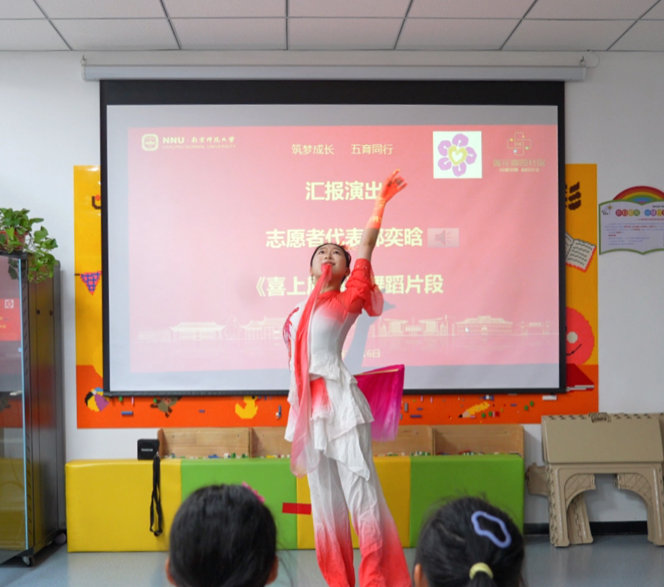 结营仪式上,南京师范大学外国语学院志愿者与孩子们用歌声和舞蹈完成汇报演出,共同重温两周的成长。志愿者带来的《喜上眉梢》舞姿轻盈灵动,孩子们表演的《Bouncing Ball Dance》满是蓬勃朝气,合唱《微笑向明天》的歌声里,既藏着对夏令营的恋恋不舍,更透着对未来的满满期待。