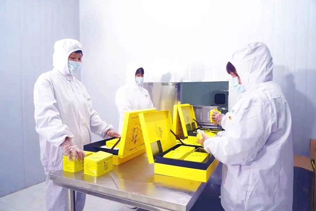7月14日下午,黄尖镇新闸村树东家庭农场的菊花产品生产线有序运转,各类菊花茶产品陈列整齐,工人们正忙着进行订单核对和打包发货。